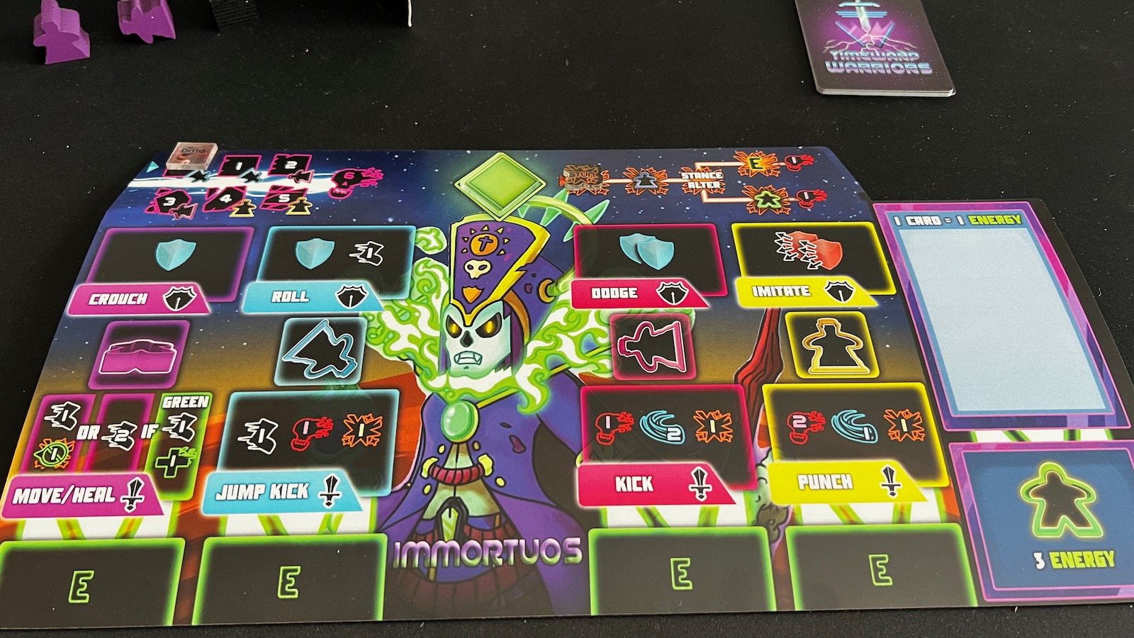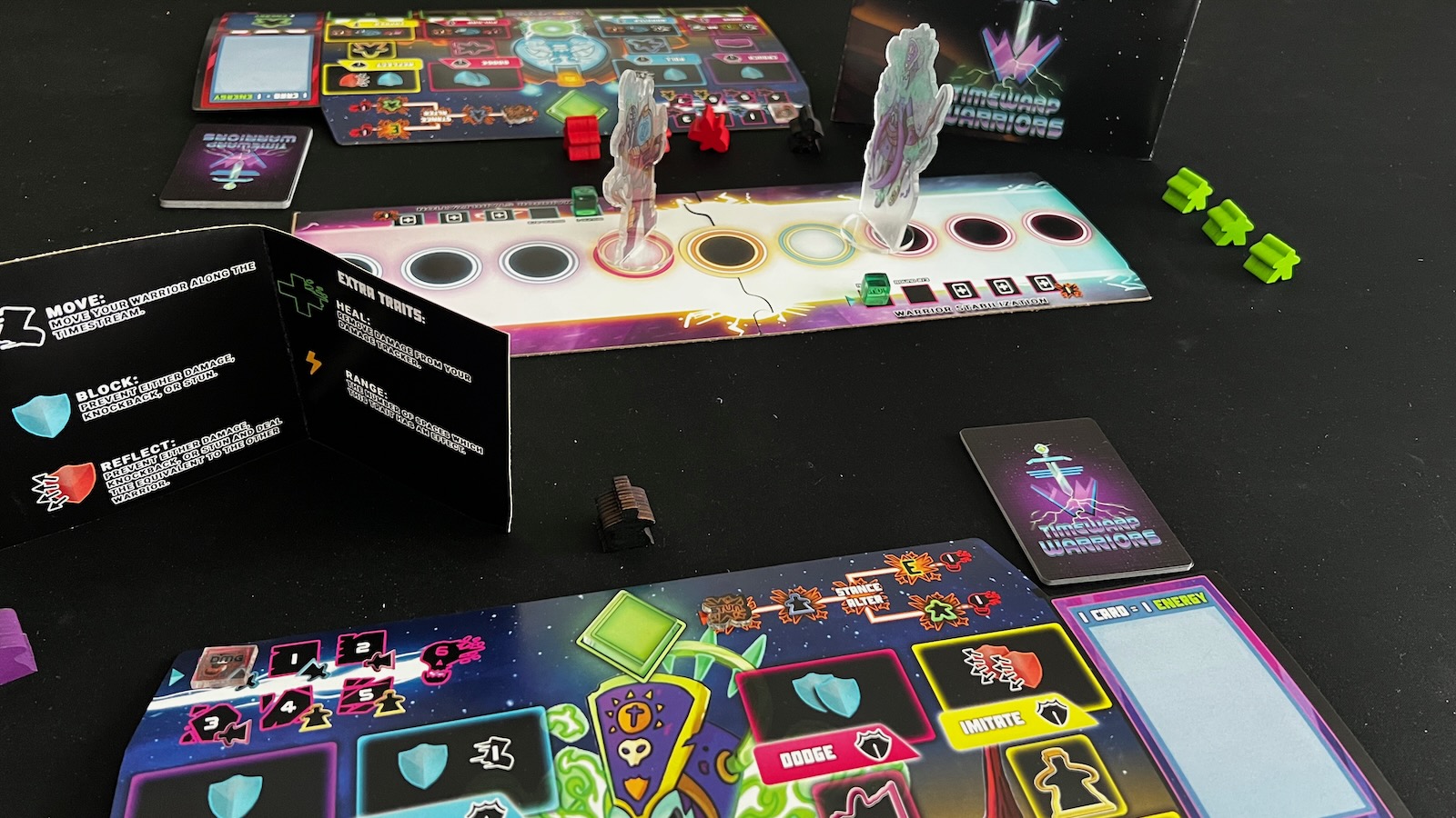 At the start of the game, each player will choose one of the four warriors each with their own unique player board, set of meeples, player deck, and standee. Players will sit opposite of each other with the timestream board in the middle of the table, consisting of a series of spaces that their character tokens will use to fight.