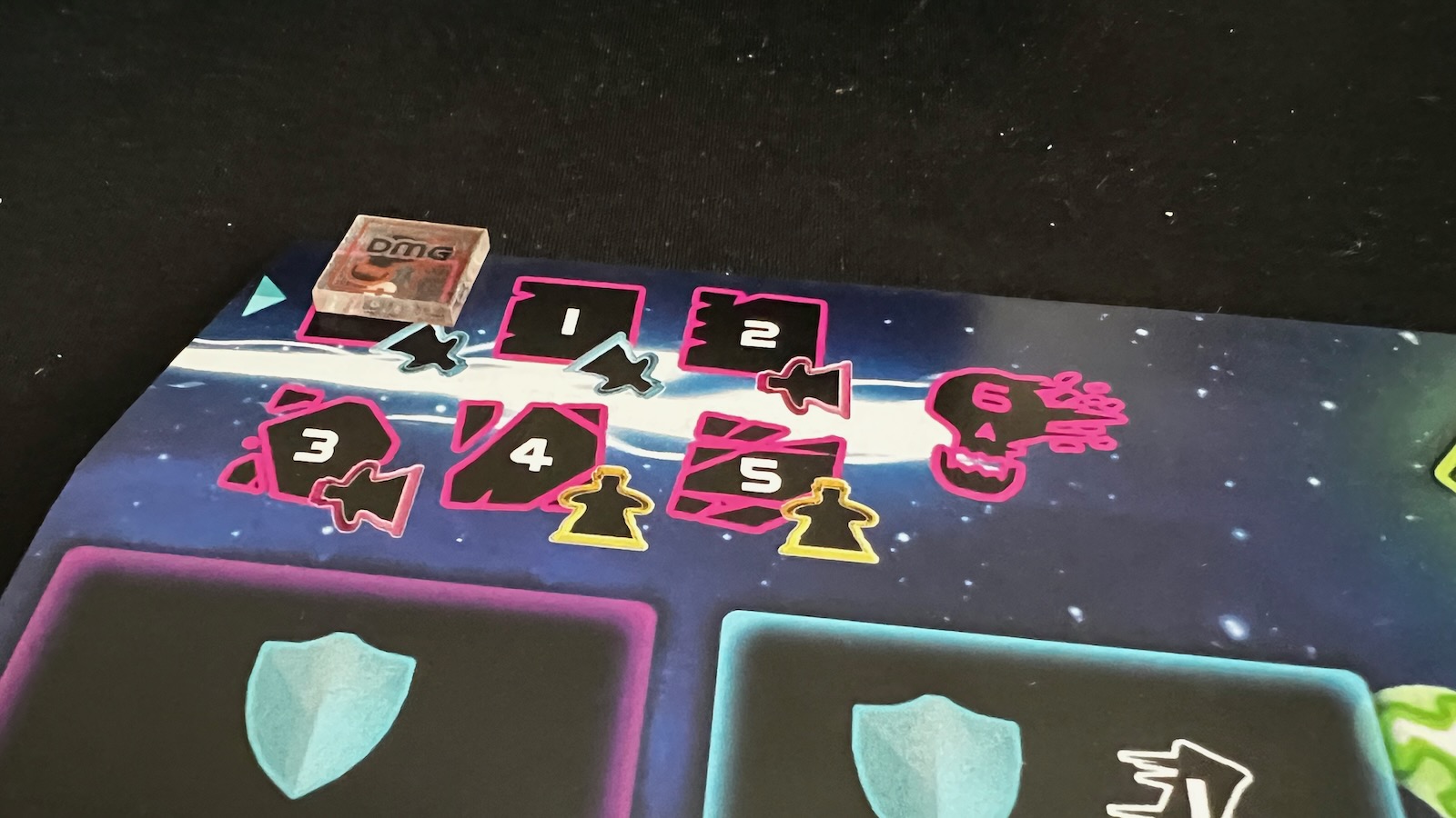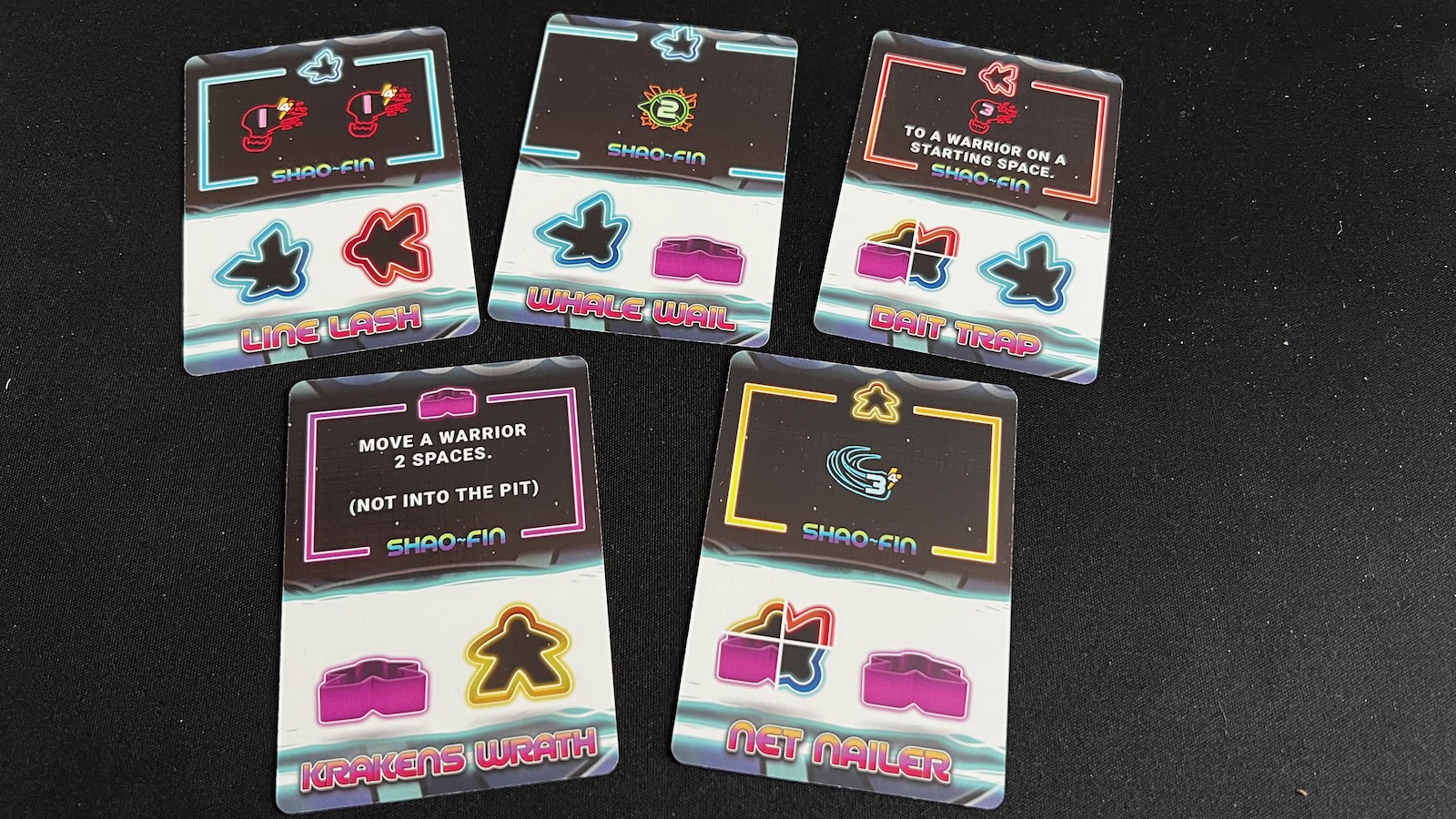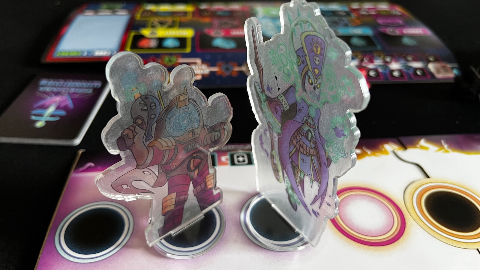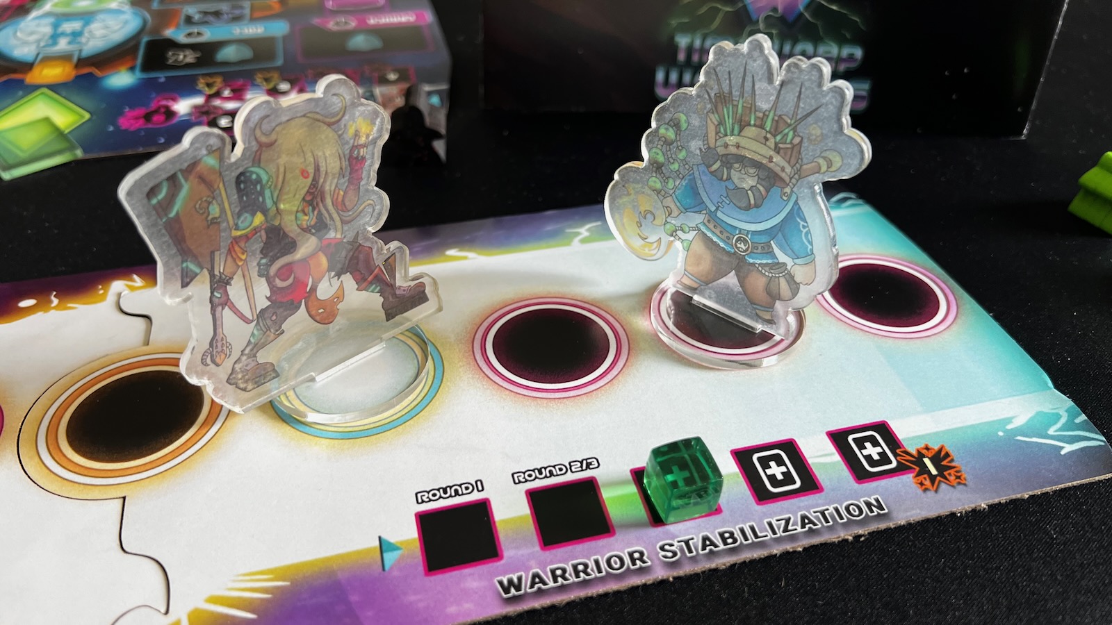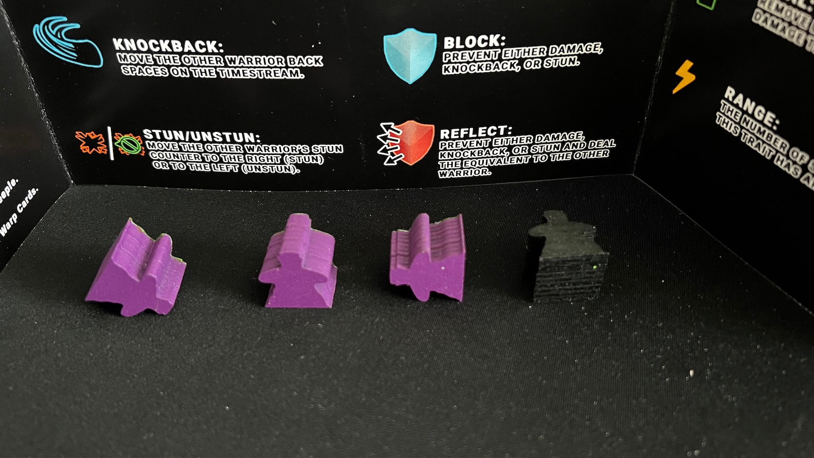 As mentioned before, a round ends when a warrior gets pushed off the warpstream board or receives enough damage on their tracker. The defeated warrior loses the crystal on their board, but then gains a shadow meeple for the remainder of the game. The shadow meeple, like the warp meeple, gives the player more opportunities for attacks and defense when rolling. The game ends when a warrior has won two rounds.