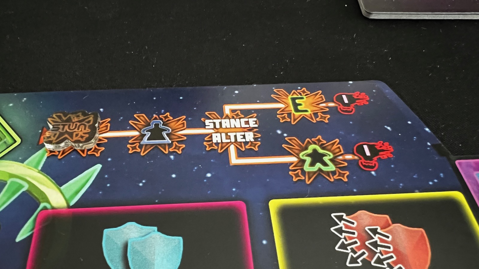 Damage is tracked on the player boards and if damaged too much, a warrior can be defeated. Stunning moves another tracker along the stun track and disables player abilities the further down the track it goes. If players are being attacked and have any meeples remaining behind their screen, they can reveal the meeple to perform a defensive action. Defensive actions help mitigate attacking effects and can even deflect an attack back on the other player. Apart from basic attacking and defense, players can find other icons that can help them out including movement along the time stream, healing stun and damage effects, and adding range to attacks.