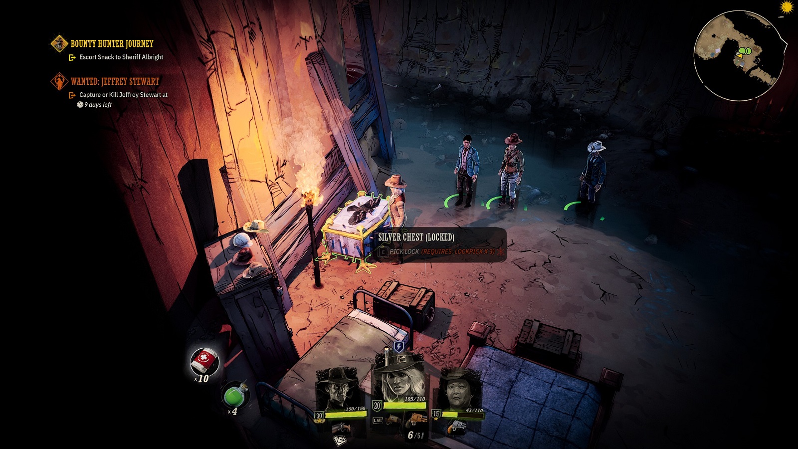For every minute I spent unloading rounds on my enemies and/or victims, another was spent walking and talking. Weird West’s world is dotted with towns and points of interest, which Jane and co. can travel to and from by selecting desired destinations on a map. Depending on the distance, traveling could burn a few hours of in-game time to a few days. Many missions and events are time-based, and so planning out trips becomes somewhat important. In addition, the longer the journey, the higher the likelihood that the party will stumble into one of the game’s randomized travel encounters. These range from quick conversations to fierce fights.