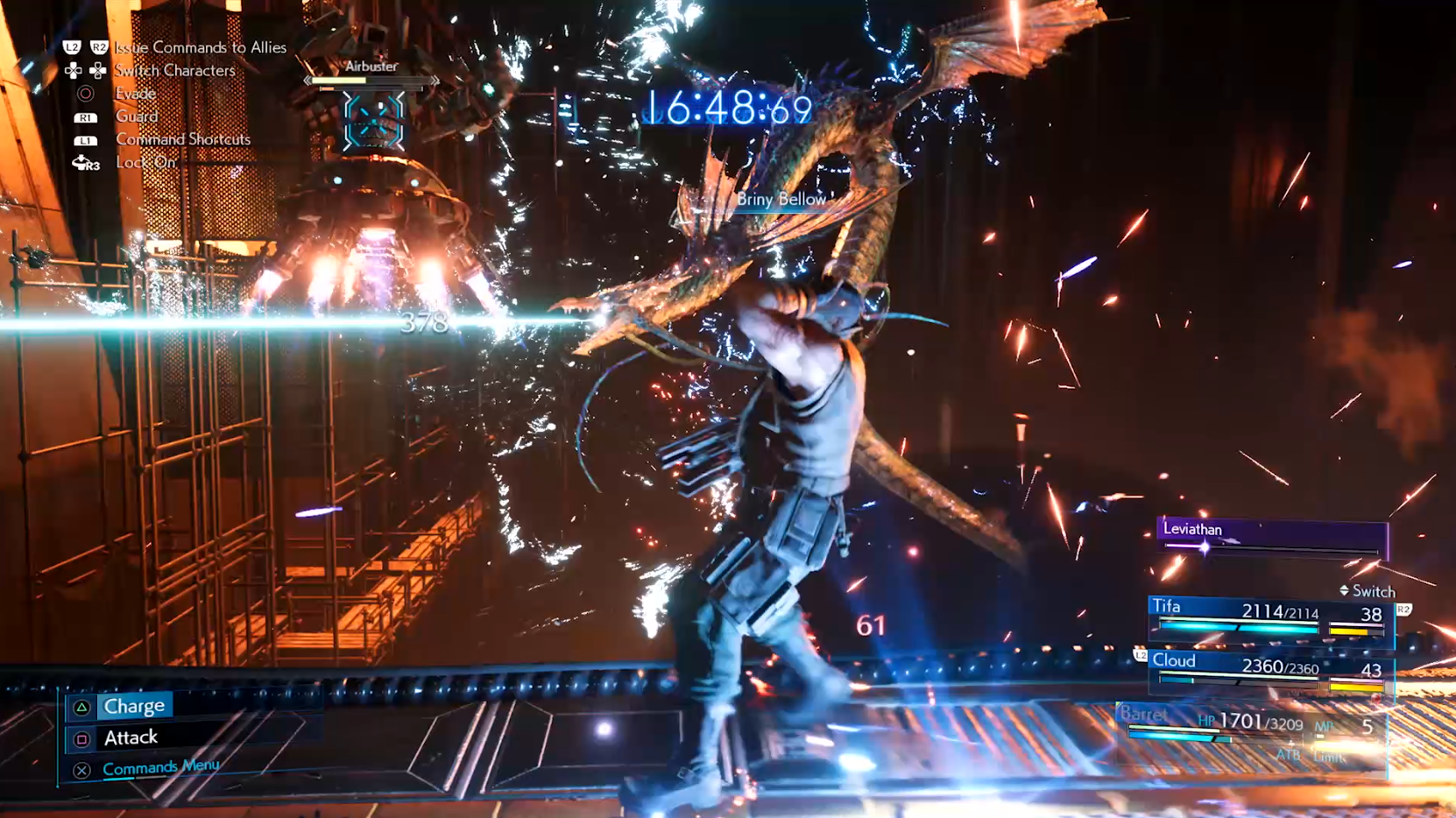 The classic blue Final Fantasy VII menu still exists, though with a flashy graphical overhaul. Opening the menu slows time to a crawl, though it does not truly stop it. This gives players plenty of time to look over their attacks, spells, items, and skills. That said, those who thrive under pressure can use the shoulder buttons in combination with the face buttons to execute skills and magic without having to slow down and open the menu.