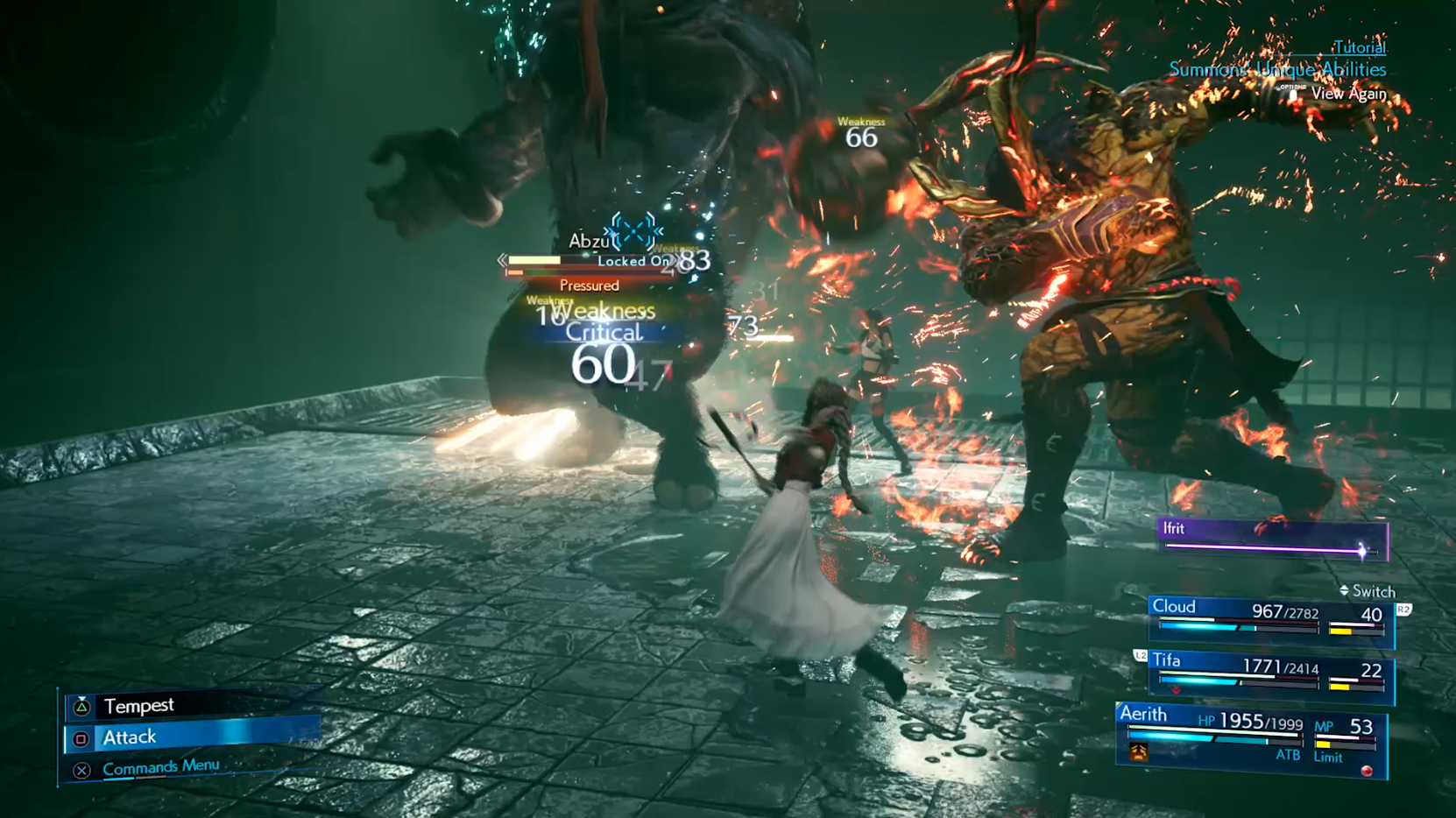 Summons have also received an overhaul. Weapons each have dedicated Summon materia slots, and you will only be able to summon once per battle–so choose wisely. Rather than initiating a cutscene and delivering a lump sum of damage, summoned creatures now linger on the edge of the battle field for a stretch of time, and join in the battle, dealing out damage like a teammate. They also have their own skills, activated by the Active Time Battle bar. Once the ATB is filled you can choose to use either your character’s skills, or the skills of an active summon, but again, you’d best choose wisely. One of Ifrit’s skills for example, would deal a large amount of damage to an enemy, but would also deal splash damage to anyone nearby, making positioning critical.