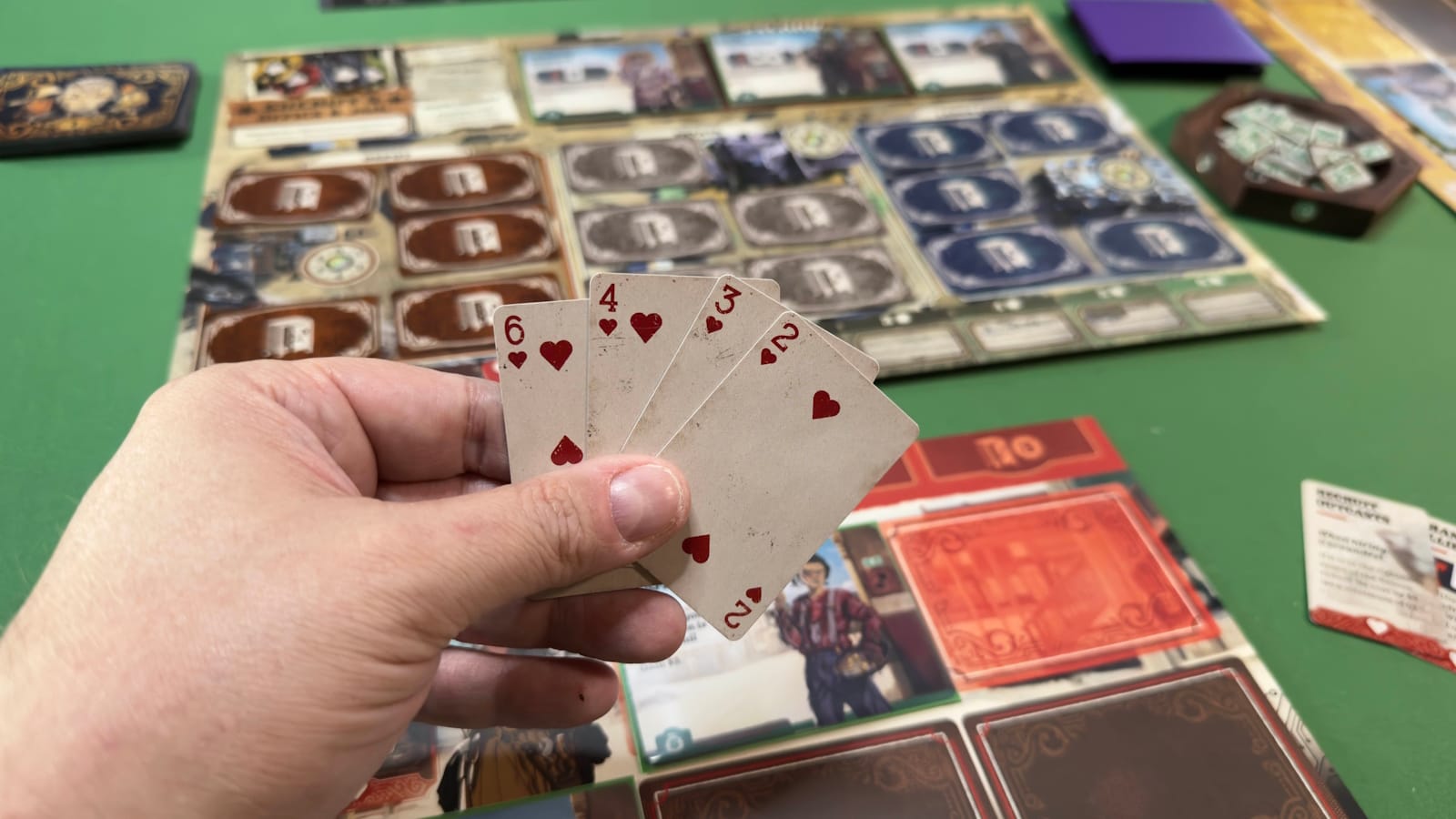 Each turn, players will utilize one of six actions. To play an action, they need to play one of their 4 poker cards face down on the action, meaning that once the action is used, it can’t be used again until the next round. Both the cards and action locations have a number on them. Importantly, the cards and numbers you play them on do not have to be the same. However, each time you play, other players have an option to send a henchman to keep you honest. If a henchman is put on a card that doesn’t match the action, then the lying player loses reputation, and the catcher gains a reputation. If they’re not lying, then the henchman gets sent to jail for the trouble. Each reputation gives a point, though it’s possible to lose points from reputation as well. An important wrinkle here is that you cycle through 7 cards, one being a 0, which can only ever be used to bluff, so no one gets out completely honest.
