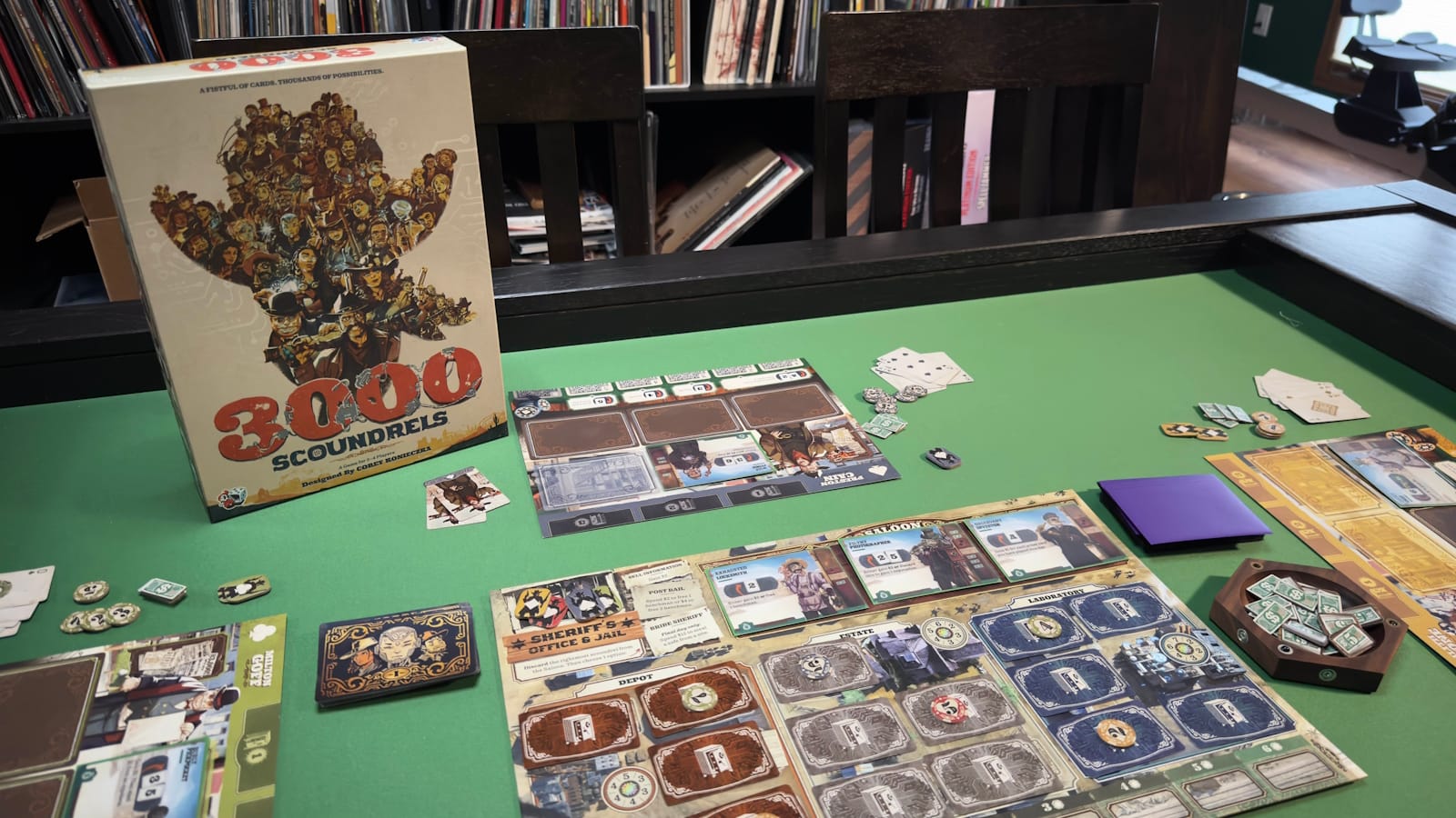 3000 Scoundrels designed by Corey Konieczka and published by Unexpected Games is an engine building game with bluffing mechanics. Players play as leaders of a gang of scoundrels in the Old West settlement the Traveler so recently left. Their goal is to track down the best, most powerful technology for themselves within 3 days. After those 3 days, the Feds will sweep the area, loading everything leftover on a train to Washington, never to be seen again.