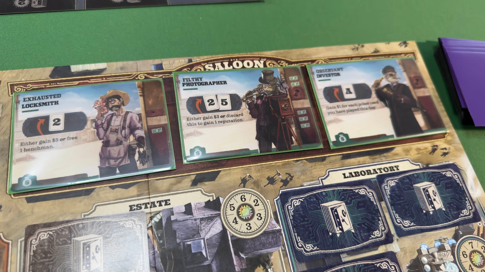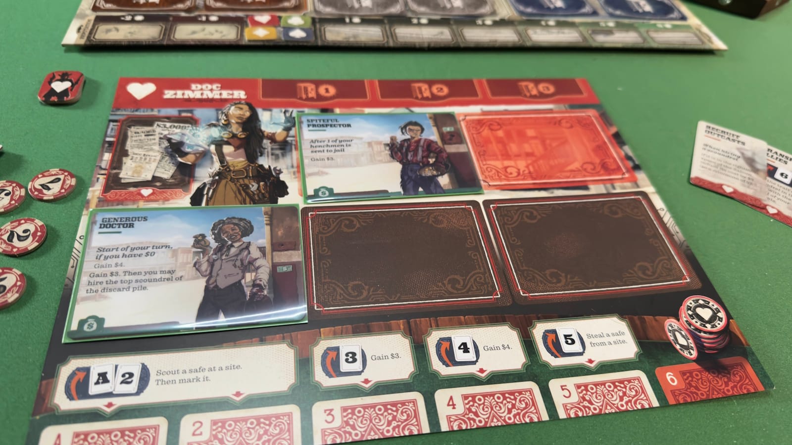 There are a few different actions that can be taken. The Ace and 2 give the ability to scout a safe, while the 3 and 4 give money (3 dollars and 4 dollars, respectively). The 5 takes a safe, and the 6 does nothing (on its own). See, each turn players will be able to use the action chosen to activate their scoundrels.