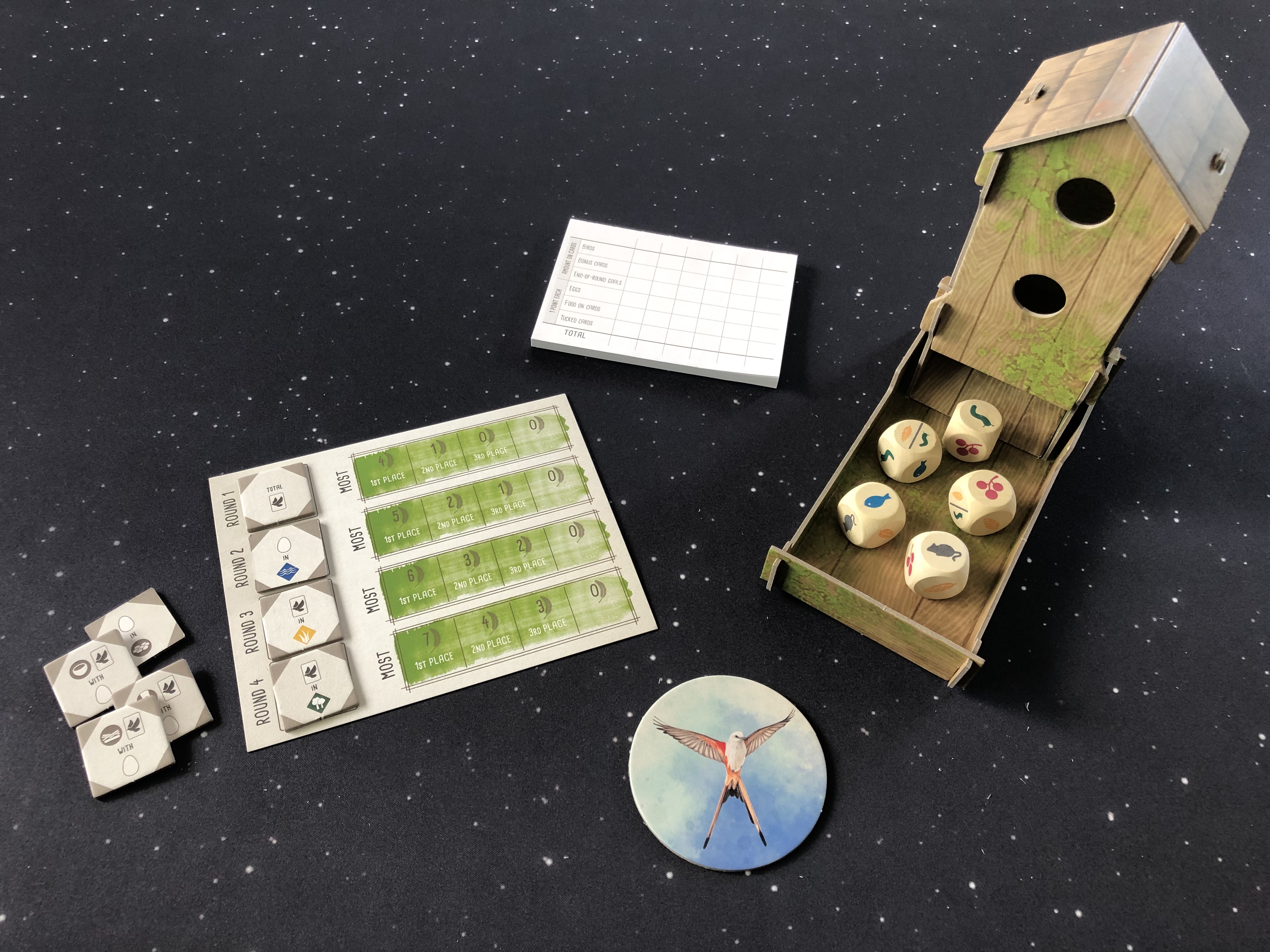 The box is graced with a magnificent illustration of a Scissor-Tailed Flycatcher (I learned this playing the game) and comes chock full of bird-themed components that immediately immerse you in this avian world. The 170 bird cards are the backbone of the bird theme. Each has a beautiful, colorful, lifelike, illustration of a North-American bird. Apart from the name and illustration, the cards contain a wealth of information about the bird that is relevant to gameplay, including the bird’s diet, habitat, nest type, amount of eggs each nest can hold and any special benefits that the card provides when played or once it is in play. There are over a hundred food tokens, representing the five general food types that the birds eat: fruit, invertebrates, rodents, seeds, and fish. 75 egg miniatures represent, well, eggs; they come in five different colors, but that seems to have no bearing on gameplay at this time. There are forty wooden cubes, five groups of eight, for the players to use to keep track of their actions each round. The game comes with five custom wooden dice that have one of the five types of food on each face, with the sixth face providing a choice between invertebrates or seed (meaning there are more seeds and bugs available to feed birds). There are some additional game pieces, including a goal board, eight goal tiles, five player boards, twenty six bonus cards, a scorepad, a first player token, and some cards used to run the single player version of the game. In the area of non-essential-but-cool components there is a molded plastic tray, themed with the Flycatcher again, that stores the cards that come in the game and also provides a handy place to set three single cards during gameplay. Finally, there is a bird-house styled, cardboard, dice tower. The components, when laid out on the table, tell even the most casual observer that this game is all about birds.