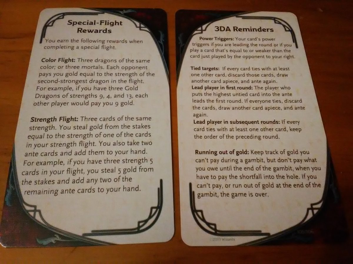 As an experience on its own, Three Dragon Ante excels. As a game within a game, diegetically inserted into your D&D game, I can’t say that it performs as well. For one, a game of Three Dragon Ante can take a while, depending on the variant rules you choose to employ. That half hour to forty-five minutes (again, roughly) can be a serious chunk out of your game time, which you would rather spend battling oozes or investigating clues or ruining the GM’s well crafted setting by setting most of it on fire. The gold values you gain in-game also amount to peanuts in most fantasy systems, or at the very least 5e, so why spend a portion of your game gambling for the same amount of gold you’ll find in the first chest in the dungeon? The game also doesn’t provide options to modify the experience in the world of your RPG. It doesn’t offer, for instance, the option to use a successful Insight check to reveal a card in another player’s hand, or a Sleight of Hand check to cheat with gold or cards. Beyond some slang it suggests you use to ingratiate yourself to the culture of Three Dragon Ante players in-game, there isn’t much support for using the game beyond just playing it. Compared to many of the homebrewed gambling options I have seen for D&D, all of which move more quickly and integrate with less effort, I doubt Three Dragon Ante will hit the table often during a session.