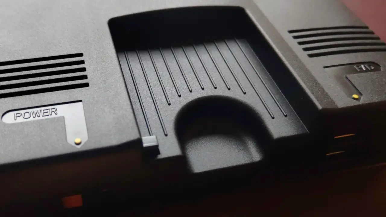 The power switch on the original TurboGrafx-16 had a small mechanical tab (a “Turbochip Game Card Lock”) that slid over to ensure that the game card wasn’t removed during play. While the TurboGrafx-16 Mini’s card slot is just for show, Konami kept the tiny sliding lock mechanism. Even the expansion port is meant to be removed like the original by pulling on the tabbed underside. It’s these kinds of details that put a smile on my face.