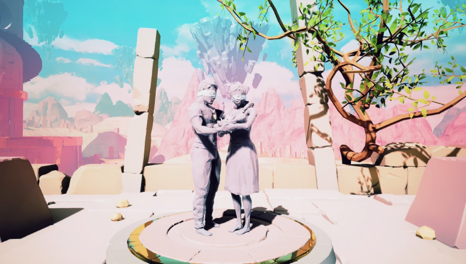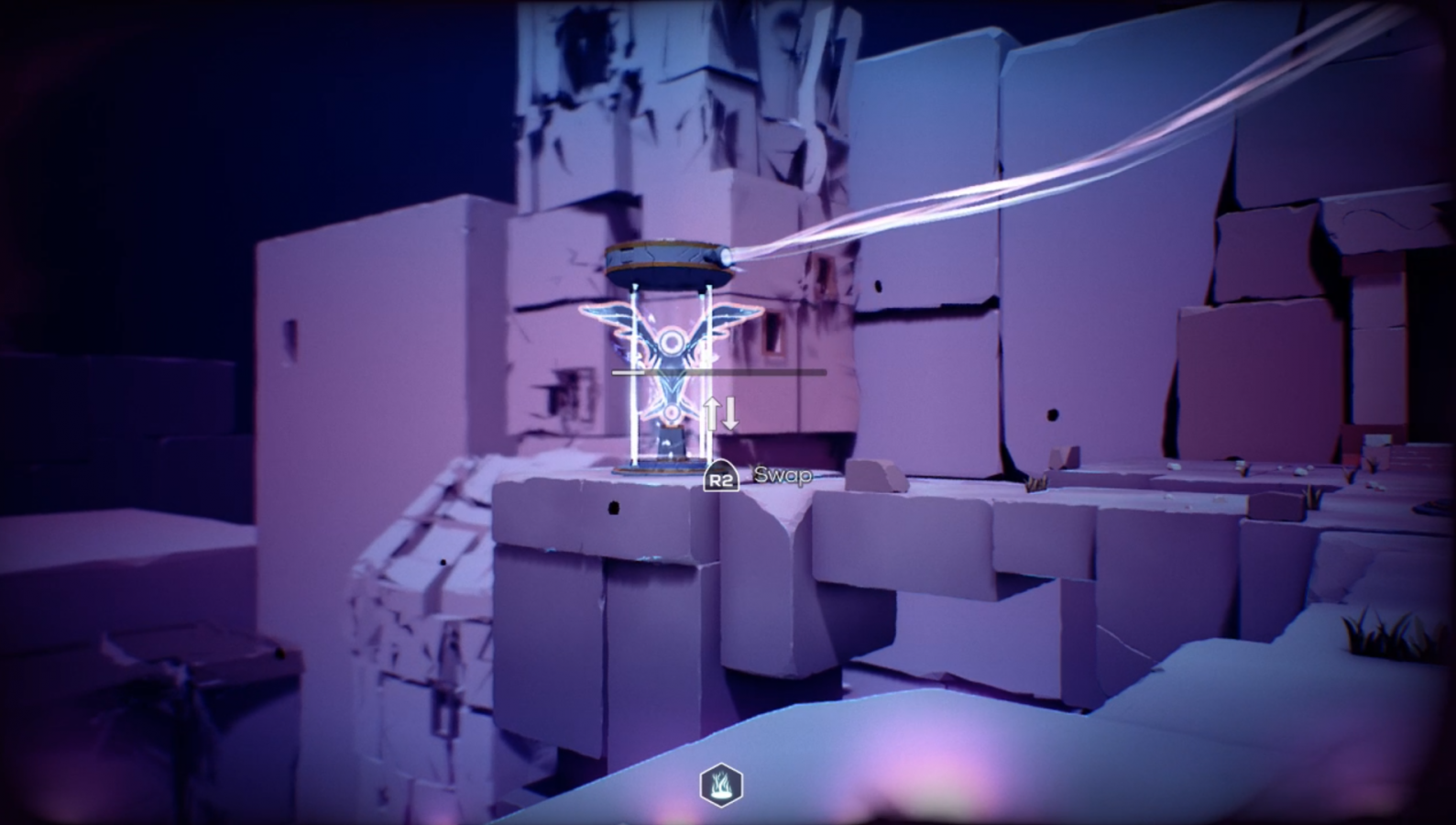 Early on, the main objects that you’ll be working with are statues. These statues allow you to swap places with them, no matter the distance between you. The only requirements are that you must either be in the dark world or have a relic attached, you must look at the statue in order to activate it, and there must be enough room where you’re standing for the statue to be placed. For example, if you’re on a staircase, you can’t swap with a statue since there’s no room for it on the stairs. Other than that, you essentially have a ton of freedom. You’ll use this swapping ability to cross gaps, move statues onto switches that need to be activated, and much more. In addition to the statues, you’ll eventually run into objects like harps that temporarily fix broken bridges for as long as the music plays, large eyeballs that let you enter the dark world just by staring at them, and a few others. All in all, I’d say there’s some pretty neat concepts in The Sojourn.