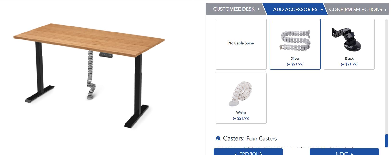 There are nine desk surfaces to choose from, including plain white and black. In my case I went with the all-natural bamboo surface. It’s environmentally friendly, twice as strong as regular wood, and it looks gorgeous. The edges are beveled meaning no sharp edges to press on your wrists and forearms, and the 2H lacquer coating means it’s also water resistant and scratch proof. I’ve clamped two very heavy monitors to the desk and it didn’t leave a single mark when I checked underneath after a few weeks of pressure. The frame comes in three colors — white, black, or grey, and the surface sizes range from 48″ by 24″ all the way up to 80″ by 30″. From the frame to the surface, this desk is built to last.
