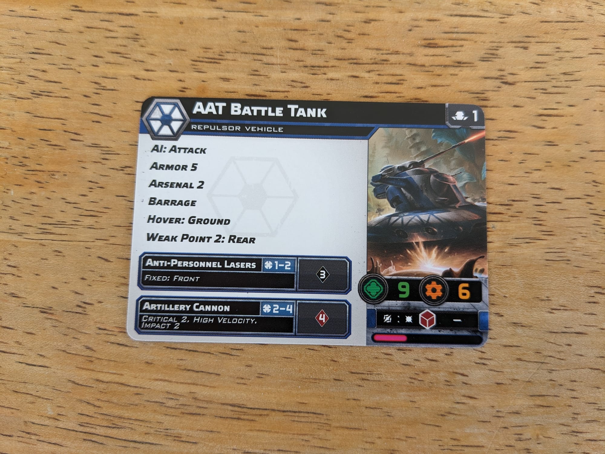 The AAT can tank a beating. 9 Health, 6 Resiliency, red Defense Dice, and no conversion. It has Armor 5 (so it cancels 5 hits when defending). Now obviously, don't throw it out in the middle of the field, but this can hold its own and take a few hits. You don't have to be cautious, but don't be reckless, either.