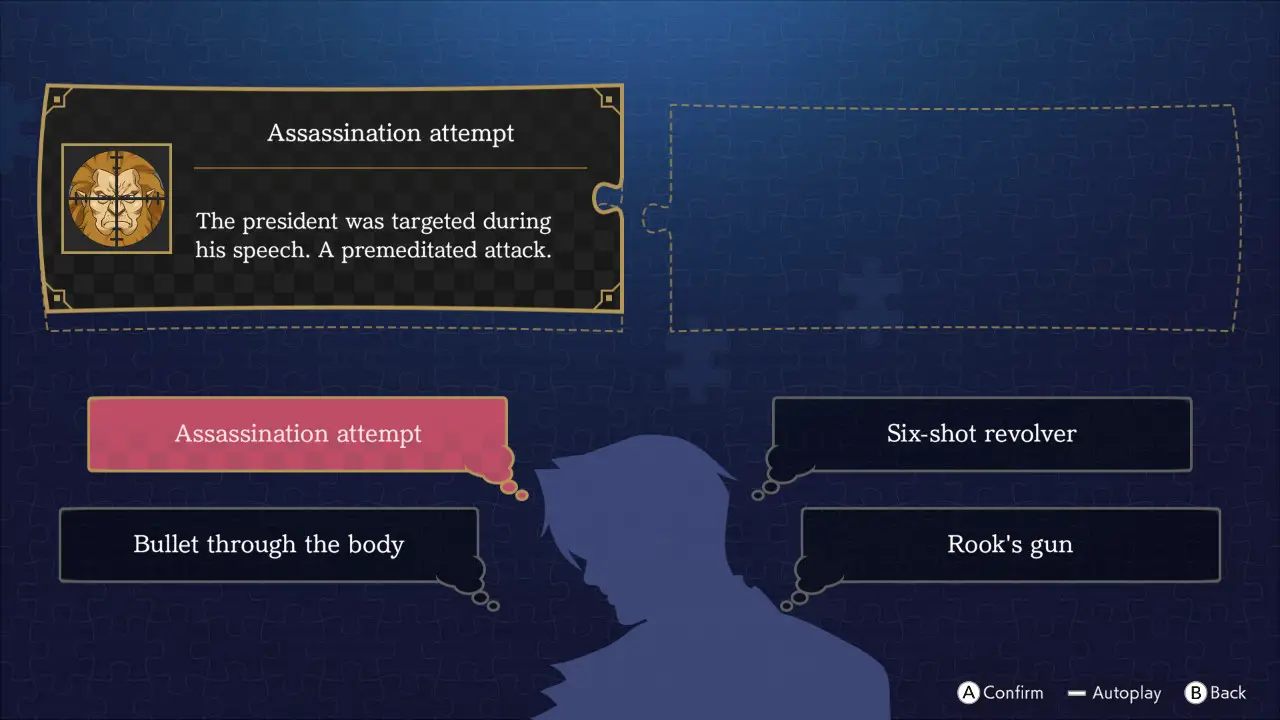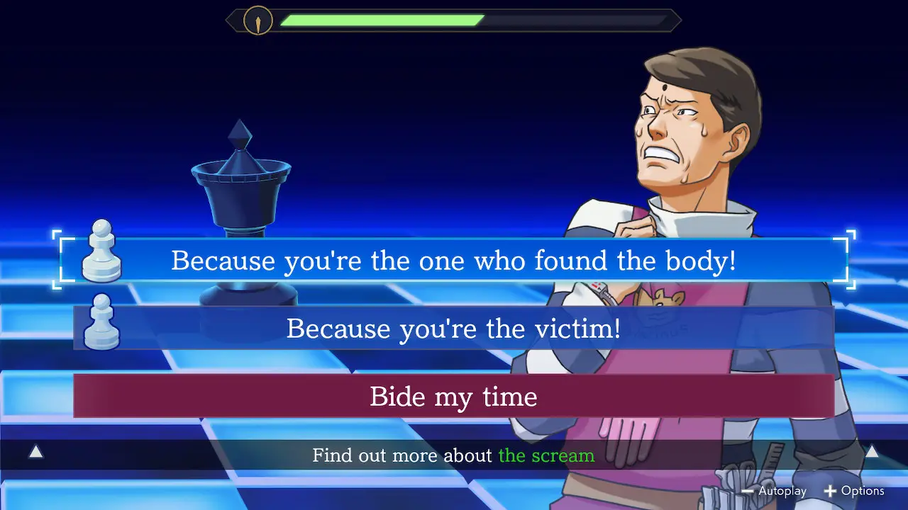 Finally, Prosecutor’s Gambit adds Mind Chess on top. When Edgeworth needs information from someone less than forthcoming, he can play a game of Mind Chess with them to trap them in their own rhetoric. Here, you’ll navigate a dialogue tree to either point out contradictions in what the witness is saying or keep your mouth shut, whatever gets them to make a mistake. To know what to do at any moment, you need to pay close attention to both what they’re saying and how they react. For example, one character takes on a boxing stance when he gets defensive, letting you know to bide your time and wait for an opening. Mind Chess can’t go on forever though, as a timer counts down as you make your decisions.