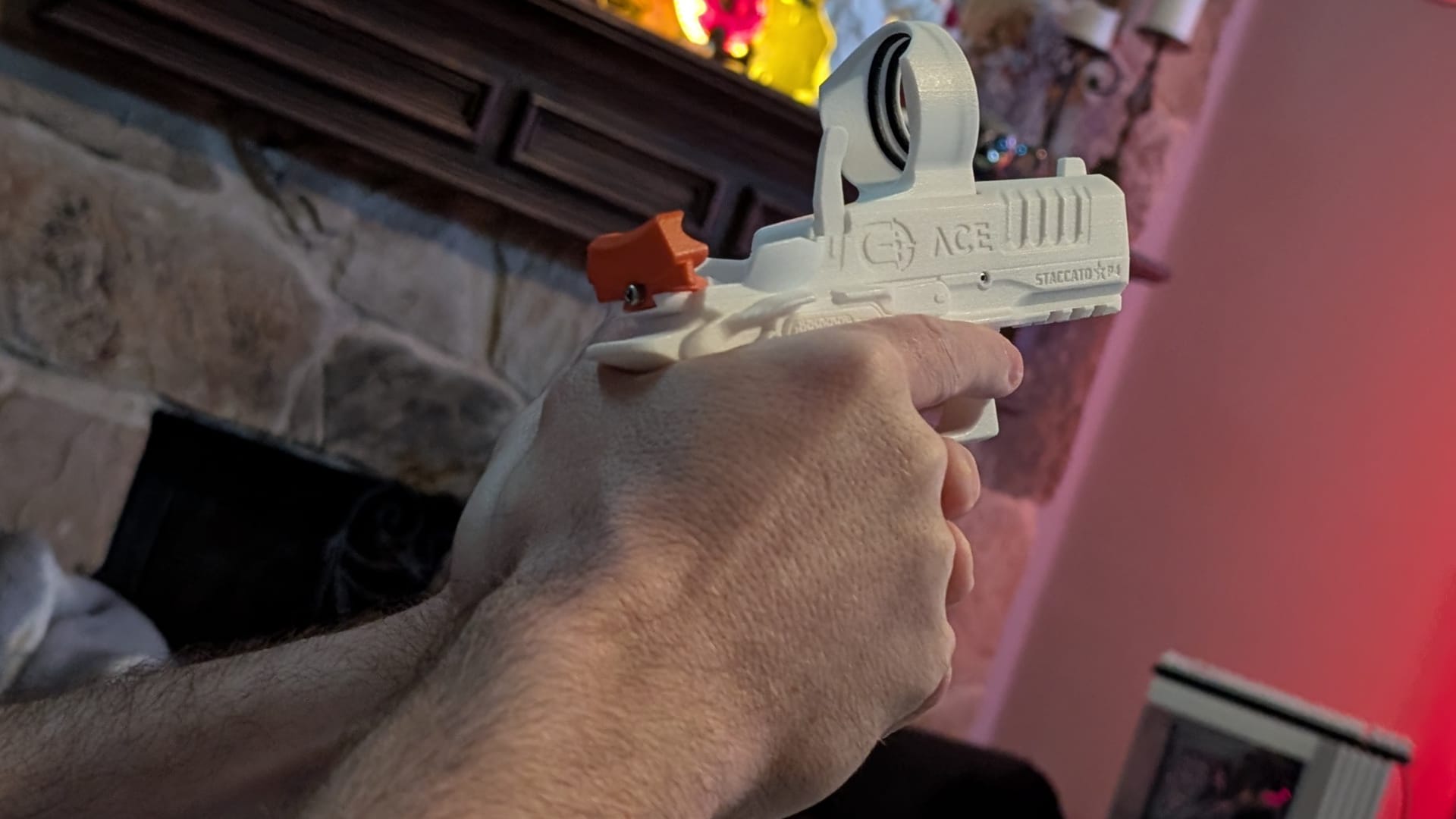 Every “toy” simulation gun I’ve used with any of the VR rigs I’ve used, from the Nintendo Super Scope to the various gun stock simulators for PSVR1 and 2, all have the same trigger pull, which is to say, almost no resistance at all. On modern headsets they often just use the trigger on a controller or the motion handsets as triggers, meaning they have a small spring that is more responsible for returning the trigger to neutral than it is a simulation of a real weapon trigger. The Ace Staccato HD P4, on the other hand, implements a 3.5 pull weight, complete with a tactile and audible click when it reaches firing position, and a forcible return to neutral trigger position between pulls. This is the same pull force as the Ruger 1911 I use as my personal sidearm, and the same action as the real-world Staccato HD P4. As such, it perfectly simulates the firing of a real gun, albeit without the recoil. Surprisingly, the simulation doesn’t end there as the Staccato HD's ambidextrous mag catches are also modeled here, able to release a magazine without adjusting hand position. Best of all, you’ll slap your next magazine in with a tap of the bottom of the handset, just as you would to seat a mag in the real world.
