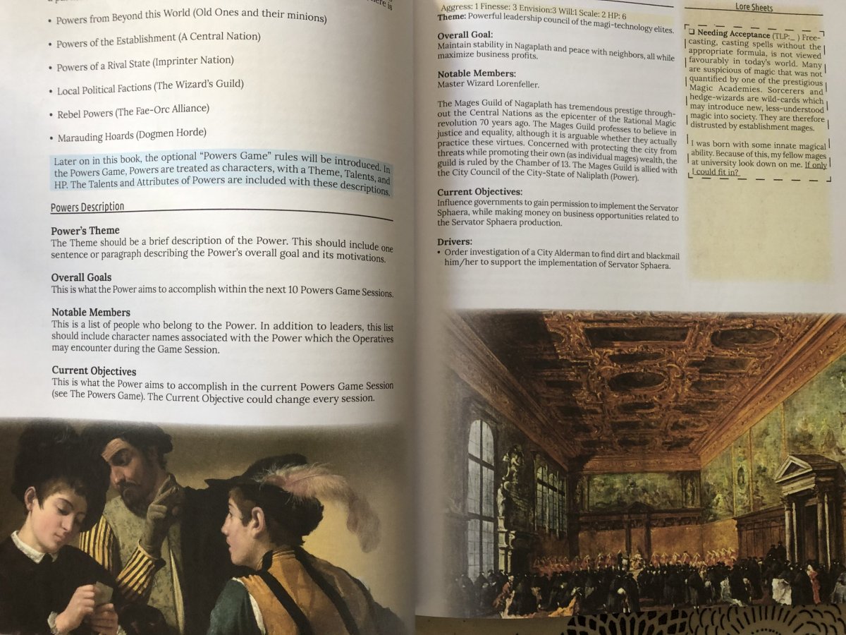 Rational Magic also has a faction system, whereby organizations or influential NPCs are represented as entities with Faction HP, and a separate set of stats: each faction is represented by its Aggression, Finesse, Envision, and Will, but also the Scale at which is can operate. The sections explaining these faction rules are extremely are well organized. All on one page, you get a great overview of each faction’s get goals, methods, notable NPC allies, and capabilities, usually including Lore Sheets with adventures or connections. Factions have mechanical ways to take action against one another, in case you want a way to track those in more than purely fictional terms.