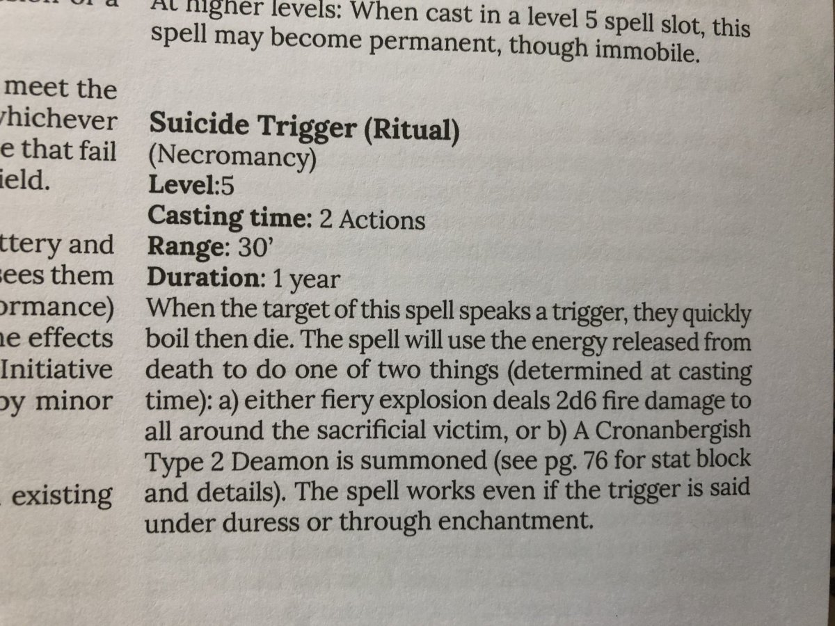Think of this spell, and the nature of the trigger. As a GM I can intuit how I think it works, but the text is so vague that I can see it leading to issues. Does the target know? Can they hear you determining the trigger? Also an instant kill on anyone as a fifth level spell?