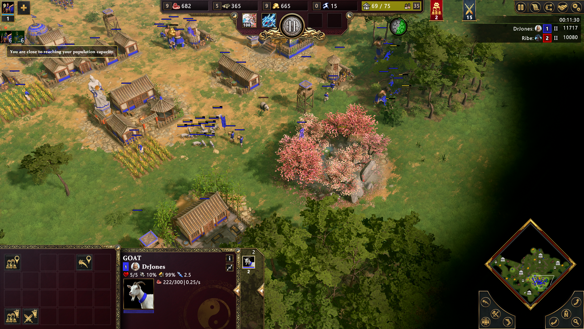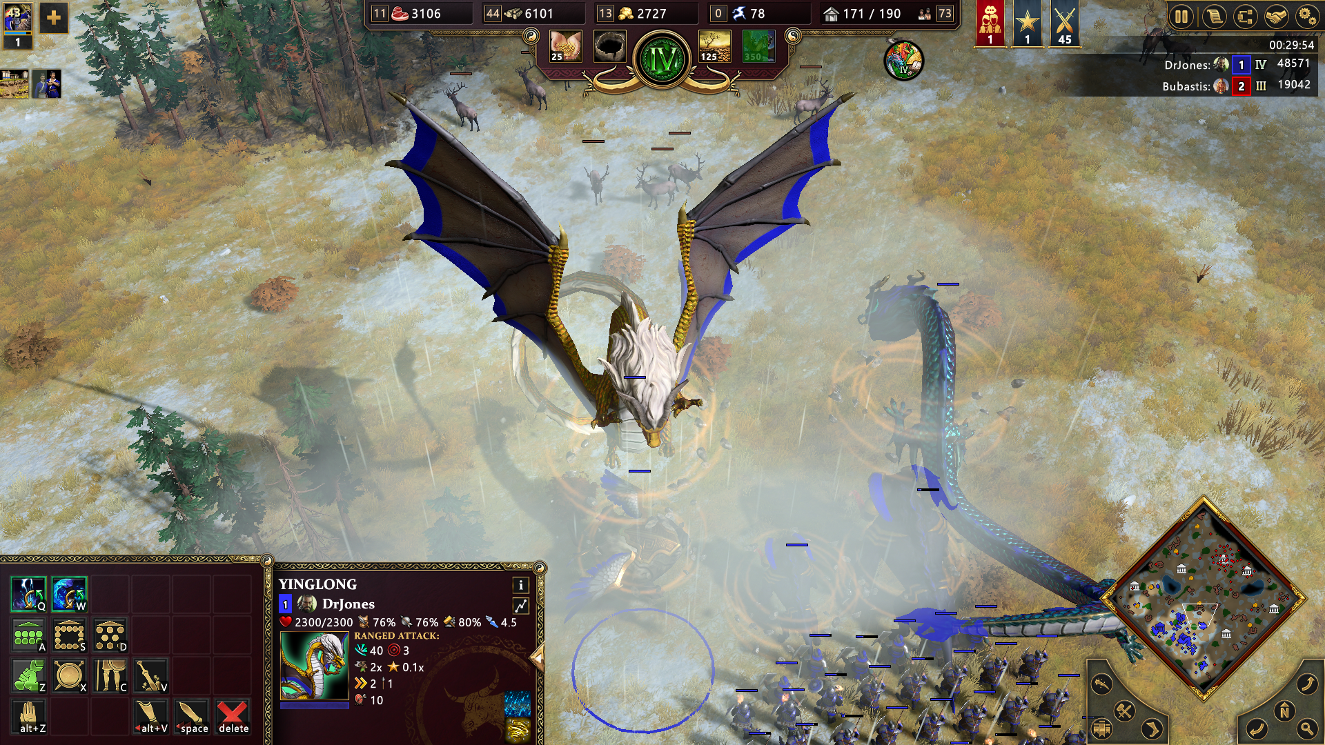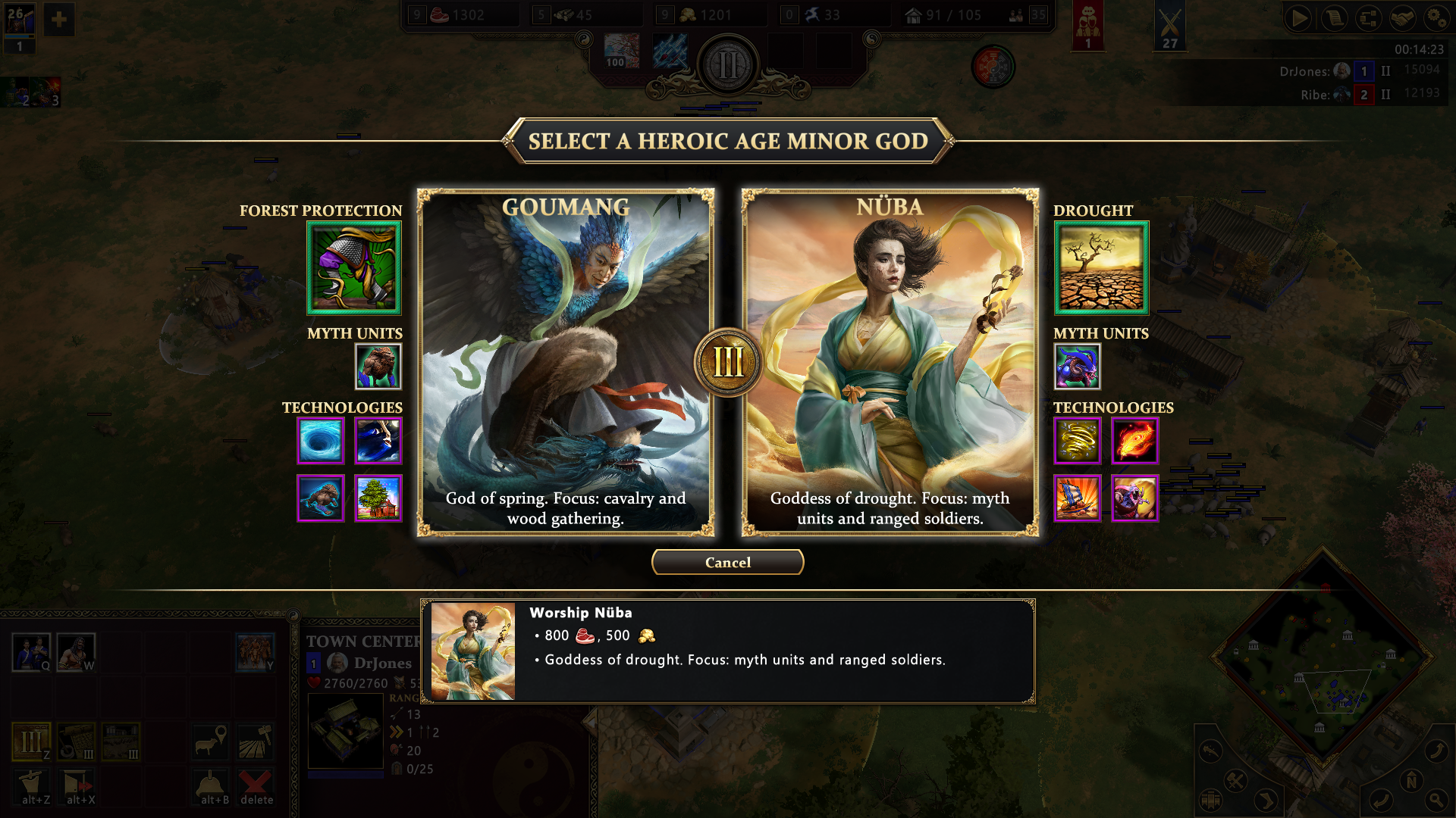 The myth units and heroes are the most exciting aspect of the Chinese. The basic hero unit, the Pioneer, is a scout that is great in the early game and can send out a lantern for safe scouting into the enemy base. As you advance, there are powerful creatures and units to take advantage of depending on the gods you choose. The Sage can heal and temporarily convert enemies to your side. Jiang Ziya nerfs enemy units. Abilities like leaping to the backline to take out critical support units can be incredibly impactful in a fight. Taotie can consume enemies to grow larger and more powerful with each kill. Finally, we have dragons. Besides the obvious cool factor, the elemental abilities of the dragons (and phoenix) are amazingly powerful and look amazing in-game.