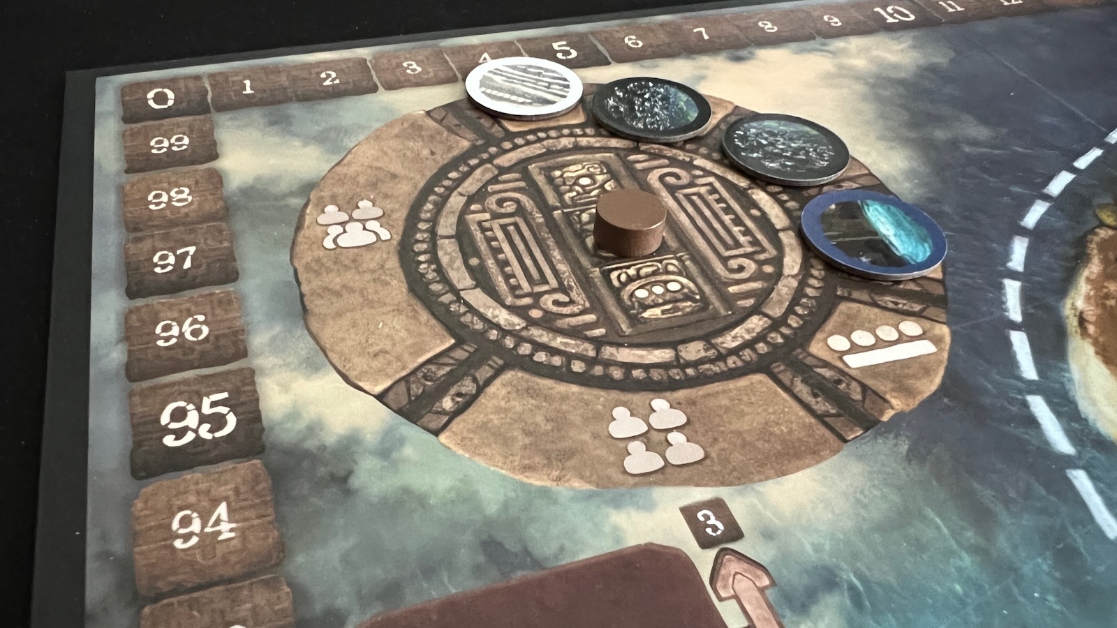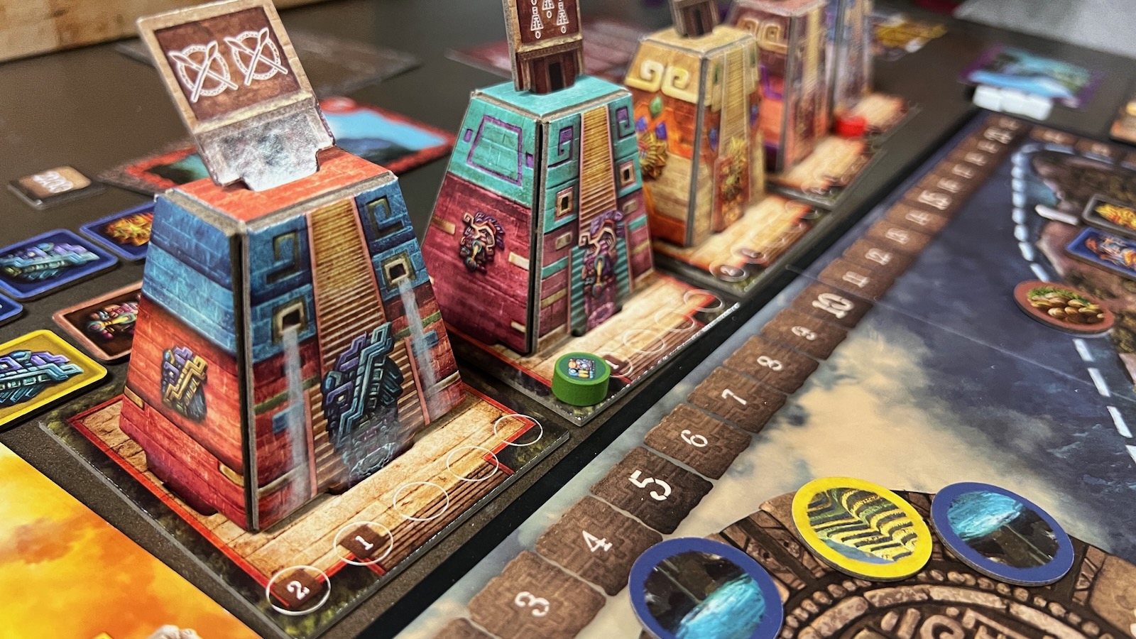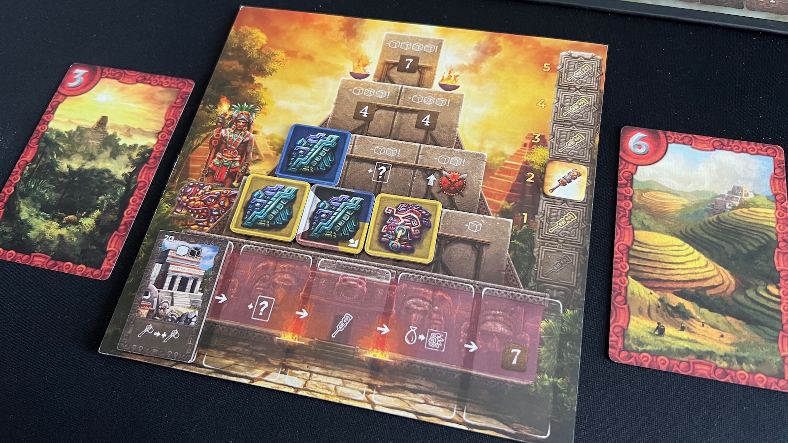 A K’atun was a period of 20 years in the Mayan civilization and serves as an intermittent scoring phase. The players will first score the temple pyramids. Each pyramid grants fame points to the players who have a disc there based on the player who earned the highest value based on the scoring condition. A choice for the game is the “Personal Scoring Variant” where players will base their score off of their personal statistics, and not the top player. Next, players will earn fame points if they have the majority of workers in each of the cities with tied players splitting points. At the end of the first two K’atun celebrations, players will retrieve their markers from the temples and reset the production tiles back on the board. Play then resumes.
