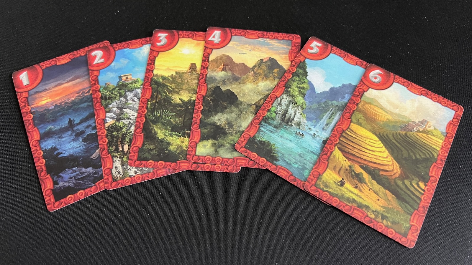 The game comes with two boards determined by the number of players. Tiles are placed around the board indicating cities that represent different Gods and circle tiles representing different resources. Each zone on the board is populated with colored tiles with representations of the Gods on different colored backgrounds corresponding to the different game resources. Five pyramids corresponding to the five Gods in the game are set up with random markers that indicate different interim scoring conditions. Players will start with a deck of six cards numbered one through six and will choose a starting tile and a player aid with starting resources.