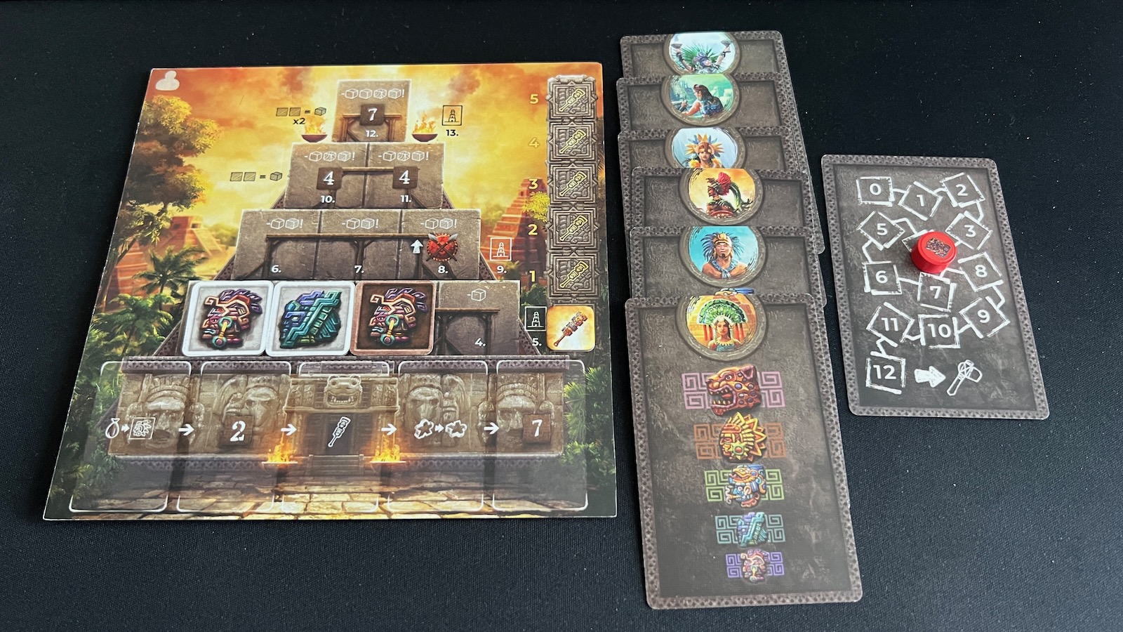The opposite side of the player board adds a night scene and changes the rewards when placing tiles on the pyramid or the building track. The building track is focused on the Might Track, with the pyramid adding more role card slots to make it more available throughout the game.