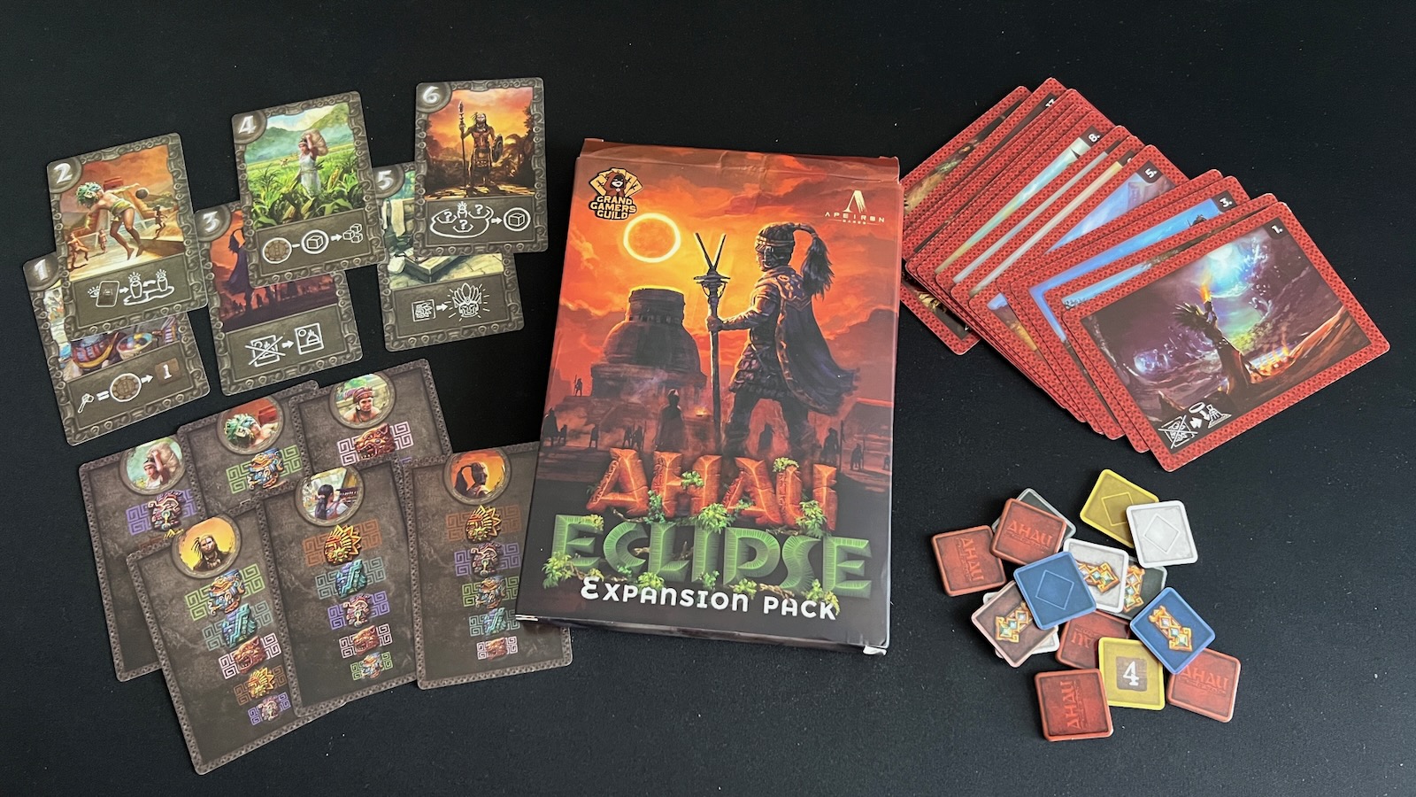 Ahau is a game for 1-5 players set in the Yucatan peninsula in what is now present day Mexico. Ahau was designed by Tamas Olah and published by Apeiron Games and Grand Gamers Guild. Players work through rounds of actions until three K’atun celebrations are held or one player can build up their pyramid or worker strength. Players will collect resources, build pyramids, and fight for control of the land. The player with the most fame, victory points, wins the game!
