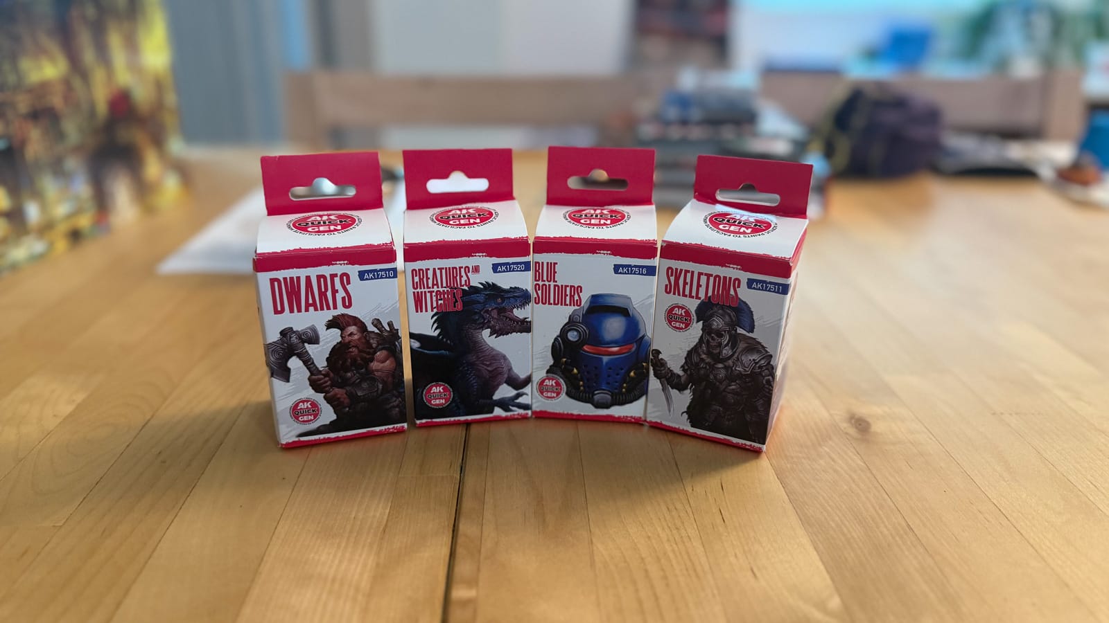 AK Interactive sent me 4 of their Quick Gen boxed lines, which are assembled according to the model that is on the package. As you can see, there’s a box for Skeletons (containing browns and a white), Blue Soldiers/Clearly SPACE MARINES (containing mostly blue, red and a metallic gold), Dwarfs (skintone and shadows), and the aptly named Creatures & Witches (magenta, blue, brown). One note about these choices is that 2 of the paints are doubled in these sets, so unless you want an additional White Shadow or Turquoise Blue, you might be better off buying a larger set or individual bottles on their own. I’ve also typically never had a good time with “themed” sets, as I tend to use a variety of colors in my paintings vs. what a company tells me what a leather or a skin tone is.