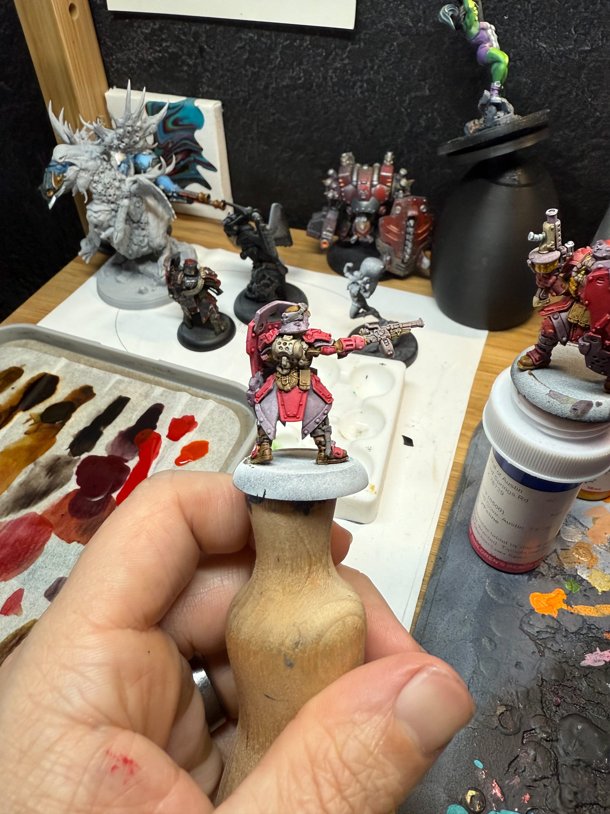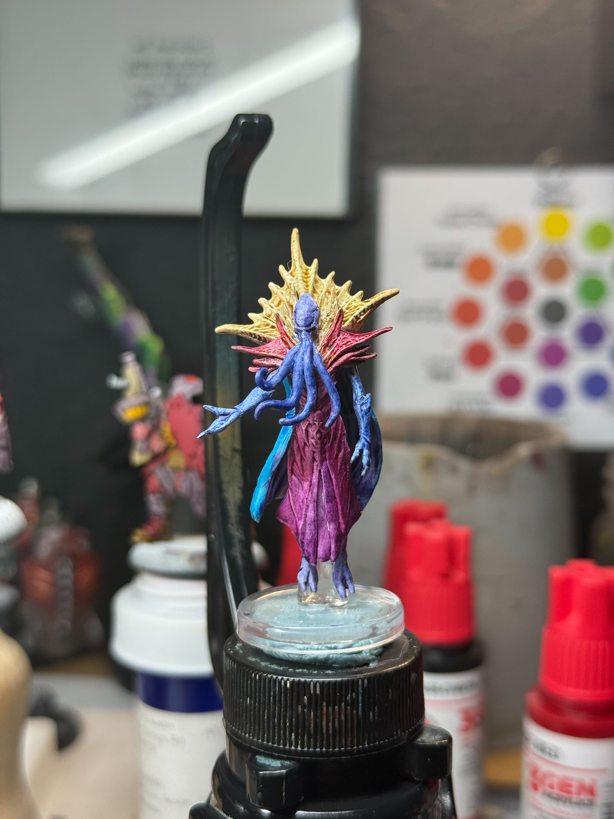 Back to the models, I was decently surprised with how the paint settled on the flat areas. Shields, armor panels all came out really well. The reds needed 2-3 coats, the gray shadow needed 2, and the browns would have been fine with 1, but I went for 2 on leather items (bags, shoes, inner outfit). And while our Mind Flayer is looking heavily saturated, some basic layering would help, but in the future, I will be more selective with my paint technique.