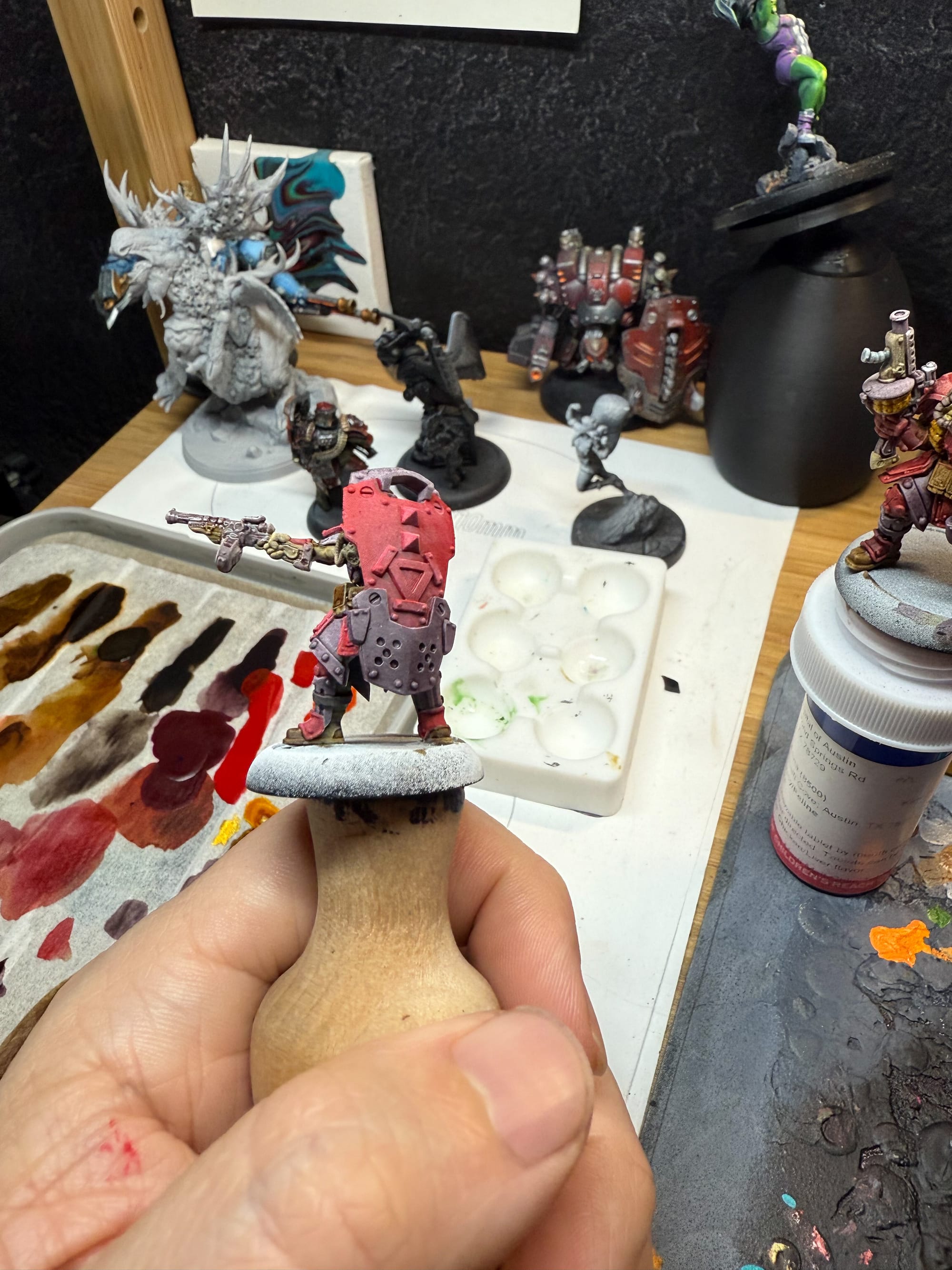 The Wizkids model is pre-primed, and if you’ve taken a deep look at those models, it tends to be somewhat glossy/satin, chunky at times. For my other models I used White Scar, which is a primer from GW that tends to put a slight matte texture on the piece.