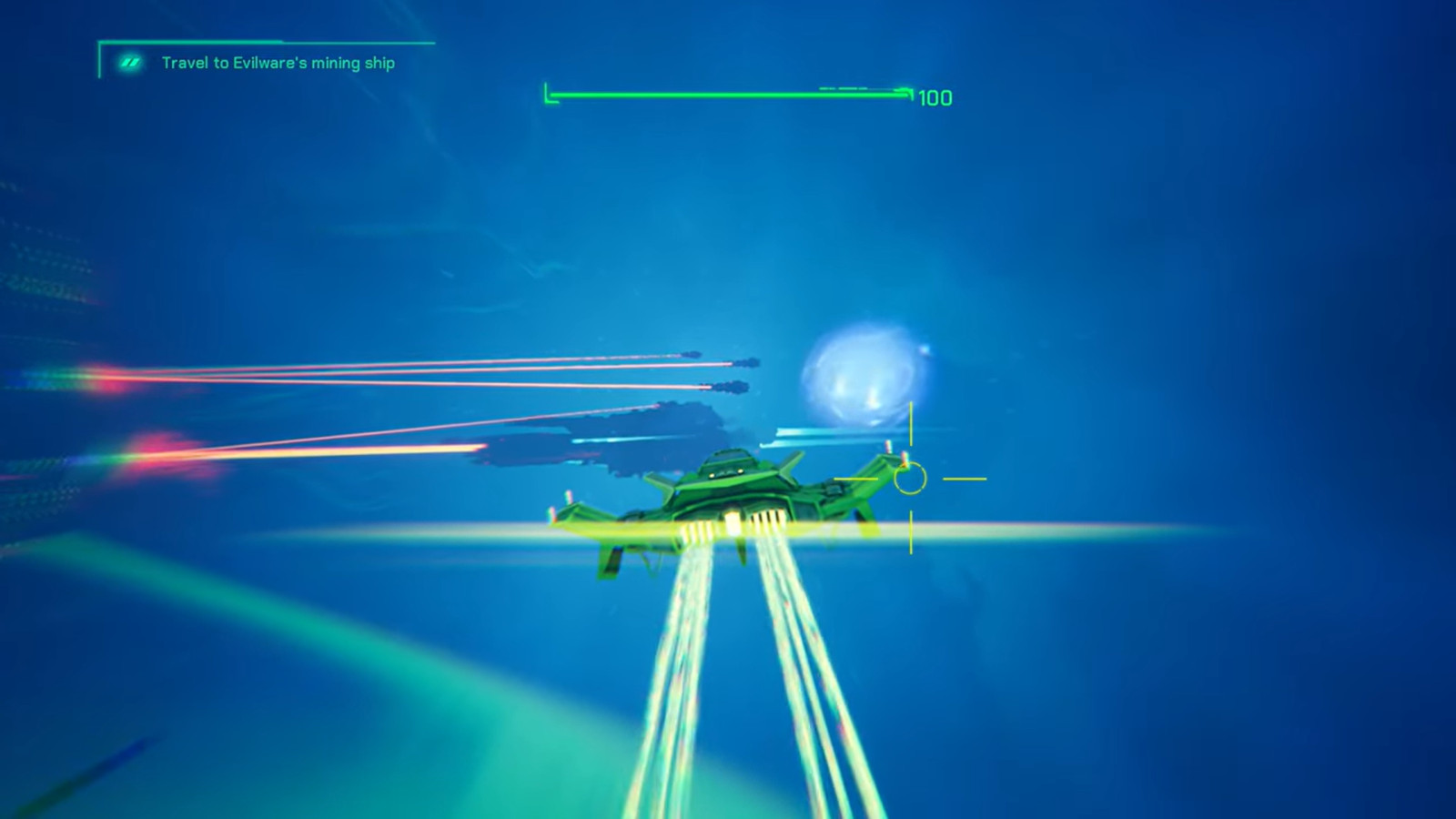 I also ran into glitches that made progressing difficult. The most prominent one consisted of the main character falling into water and then swimming from that point on, even after returning to solid ground. (Exe can’t shoot or do much of anything while stuck in swimming mode, so I was often left with no choice but to reset to my last checkpoint.) There were a few moments where I found myself invested in the gameplay. One of my favorite chapters was when Exe and Shipset were on their way to the planet Materia and they had to travel through space while shooting down Evilware’s tech, but moments like these didn’t happen as often as I’d like.