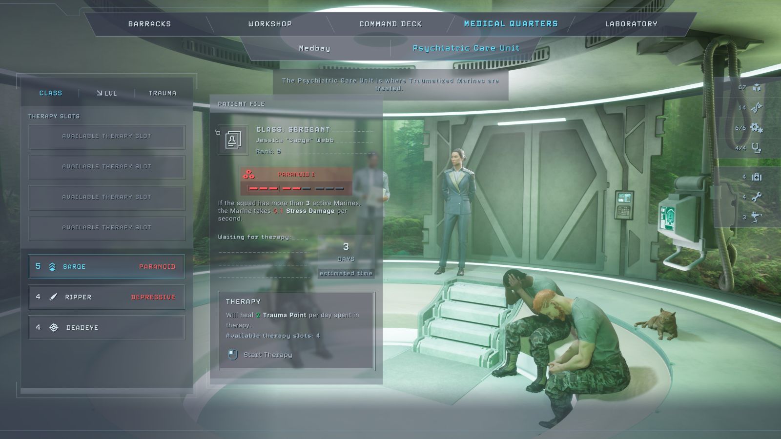 After a bit of repairs on the Otago you’ll eventually unlock the Psychiatric Care Unit. Marines under stress can develop quirks over time, and left unchecked, they can become problematic. One might become paranoid, taking a constant but small bit of mental damage when they are in a squad of more than 3. My Sergeant that regularly deploys with the Incinerator, callsign “Torchy”, suddenly developed Pyrophobia. This means any time she uses her special weapon, or oil is set on fire, she takes 15 stress damage. Somebody needs a new callsign, or at least a few days in Psychiatric care. Ignore your soldier’s mental state at your own peril – you don’t need them breaking in the field when you need them most.