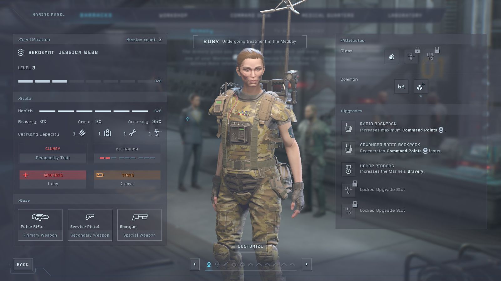 Naturally you are probably going to become attached to some Marines as well. I don’t recommend it as they are relatively soft and squishy compared to their enemies, but it happens. What about the rest of your squad while they are off saving the world? Well, once you’ve unlocked the Training Room…they train. They’ll earn partial XP while other Marines are out in the field, or you can send them to more intensive training for double XP, though this pulls them off the board to be deployed for missions and healing, and they’ll come out of it exhausted. Still, that might be worth it for when your favorite sniper ends up traumatized by seeing entirely too much. In the Otago’s medbay, you can also assign medics to shorten recovery times or even attach prosthetics to your Marines when things go particularly poorly. You’ll spend a lot of time here, so when you find a doctor you can rescue in the field, don’t miss out.