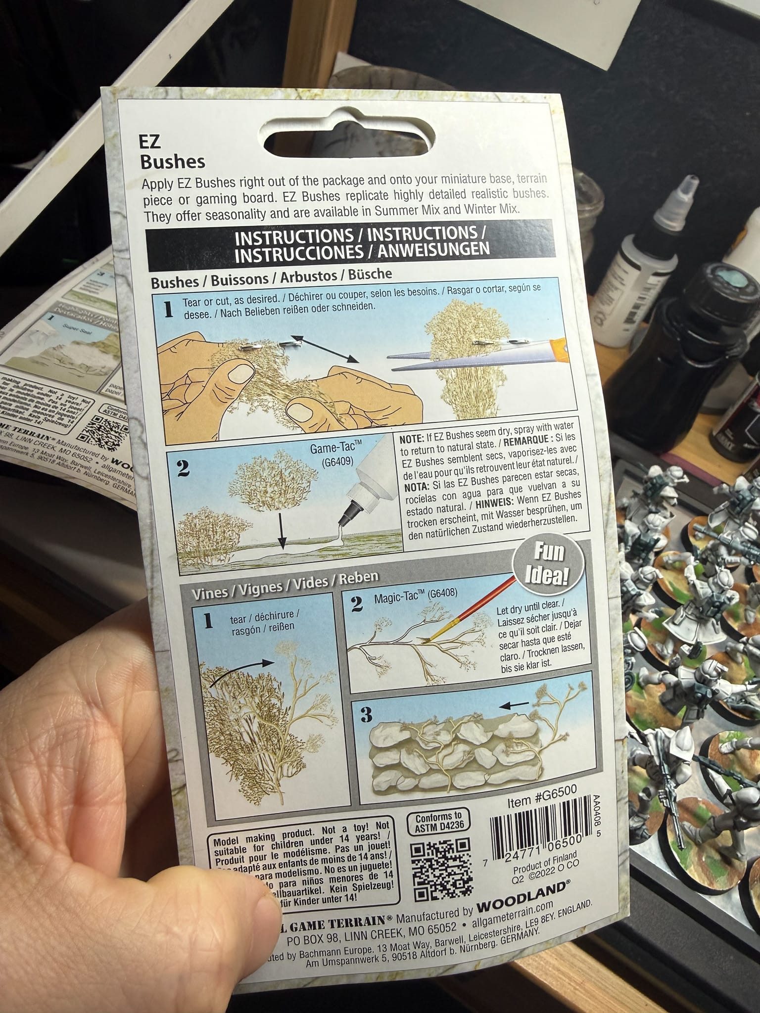 They sent me a kit which consisted of several products, including basing paint, three different glues, and a variety of sands, grass, and bushes. Each package is effortless to use, as each package has a nifty guide on the back with instructions of how to best use the product. For example, the EZ Bushes require some trimming and cutting, then using the Game Tac in order to attach them to a base, or trees, providing both bushes or a vine look. For the ground cover, like the grasses or sands, you would use the Super Seal glue (which is like a watered down glue) applied with a spray bottle. Then, by blowing grass mixture on a model, or pouring sand on a base, you can easily affix the materials to a base.
