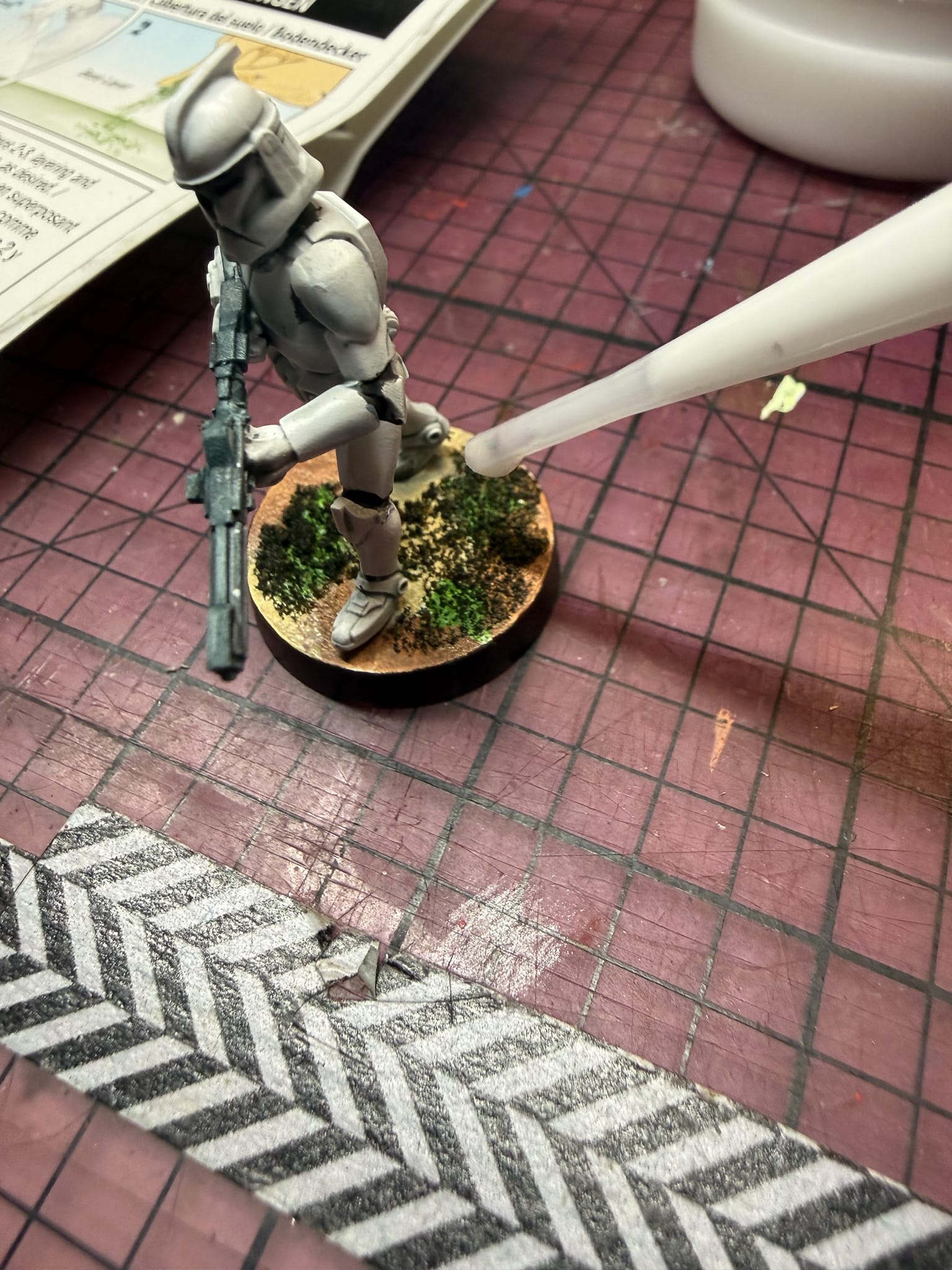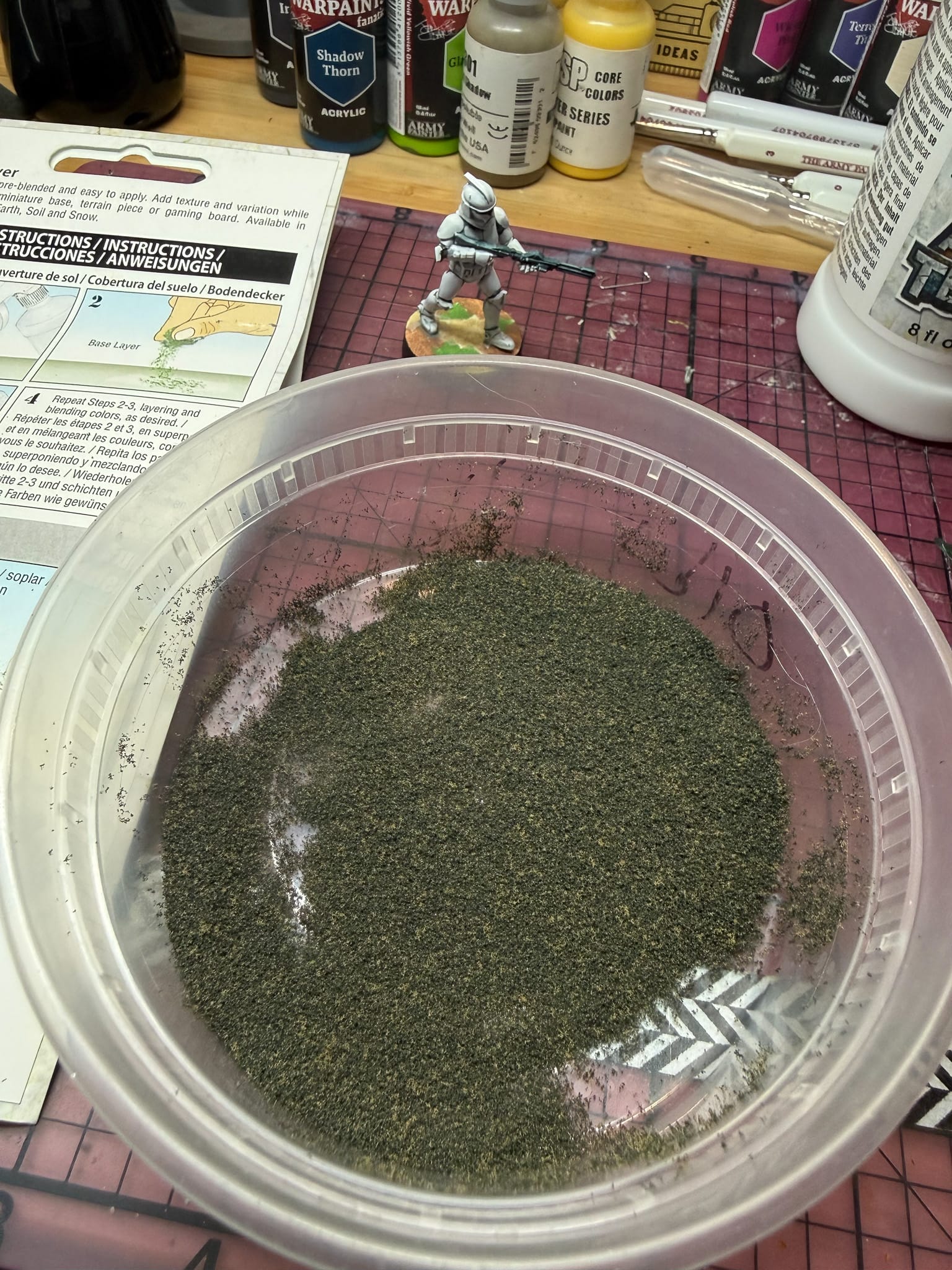 I did this on my entire Legion clone army, and what I opted to do was to make a mixture. By taking several sands and grasses and mixing them in a spare container, I had a perfect mix. I then used the Game Tac (more of a traditional glue) along with an old brush in order to spread the glue around, and then it was a matter of pinching and sprinkling my custom mixture on each base.