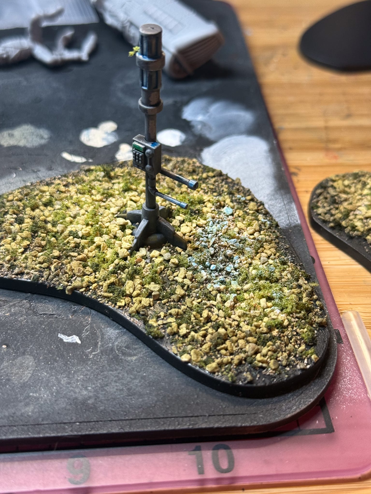 For some terrain elements, I took some of the included All Game Terrain bases and attached some Legion beacons that I figured could serve as objective markers. I then repeated my process, but went in layers. This allowed me to build up material on the bases, and with a few washes, I was able to produce some attractive pieces in 20 minutes.
