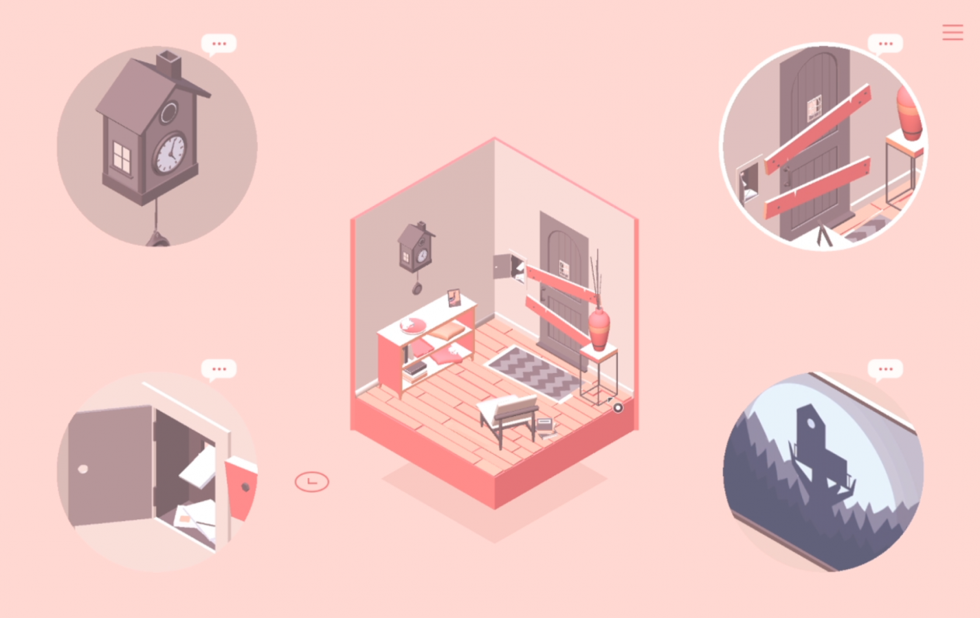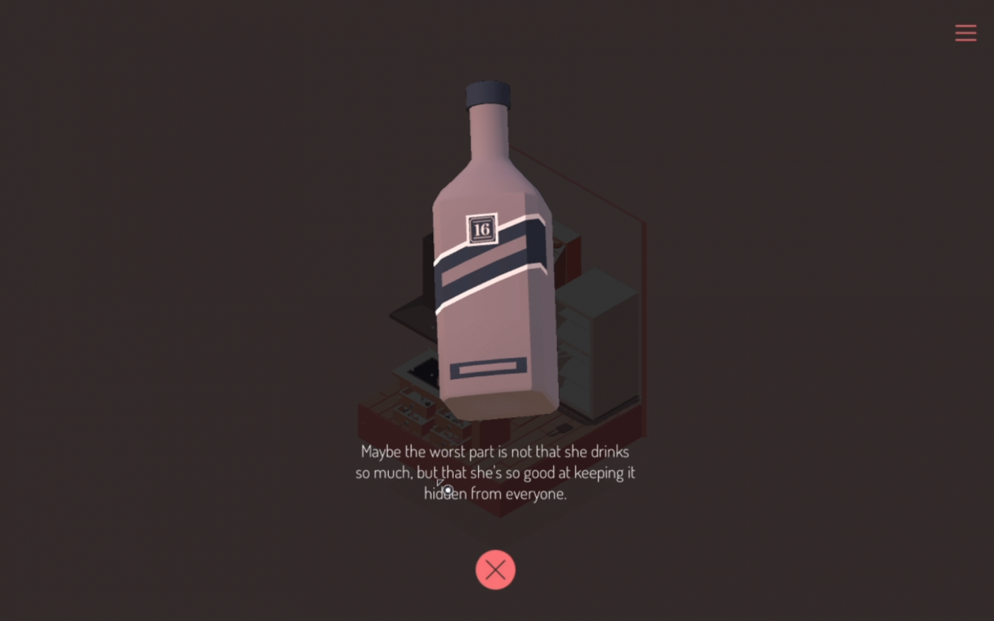 The gameplay itself involves you looking at dioramas of different locations, such as your room, your house, the city streets, and more that I’d rather not spoil. Each location is split up into multiple pieces that you look at one at a time. For example, your room is separated into different dioramas based on the corners of the room. You can spin these dioramas in order to look at things from a different point of view; in fact, you’ll have to do that in order to get anywhere in the game. Sometimes there will be an object hidden behind a dresser that you couldn’t see without spinning behind it, or maybe you need the room at a certain angle in order to see a clue. Combine this aspect with puzzle room type gameplay, and here you’ve got The Almost Gone.