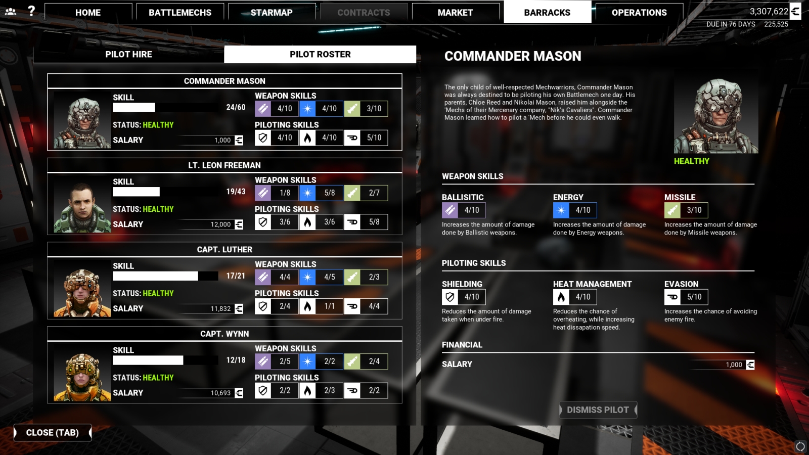 Recruiting pilots is as simple as paying their recruiting fees and their associated salaries, but how effective they’ll be is determined by a bank of six skills — Ballistic, Energy, Missiles, Shielding, Heat Management, and Evasion. The first three increase the amount of damage done with those weapon types, shielding reduces the amount of incoming damage, heat management makes better use of your heat sinks to cool your mech more quickly, and evasion increases the chances of evading enemy fire entirely. Each pilot is unique, and other than the protagonist, Commander Mason, they all have different levels of potential. One pilot may have a maximum ballistic power of three, but they may be able to make lasers dance to an eighth level, thanks to their pilot skills. Matching the meat to the mech is an integral part of ensuring both come back in one piece.