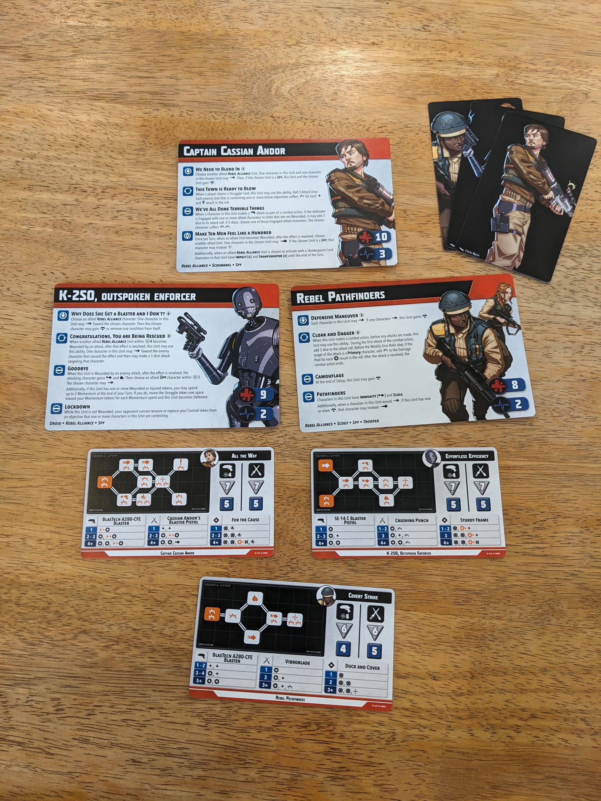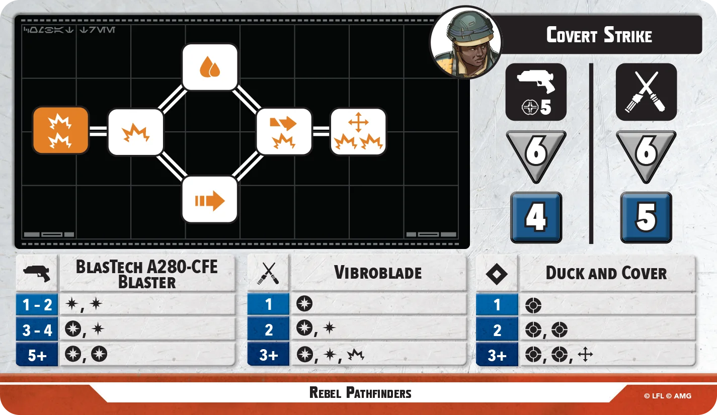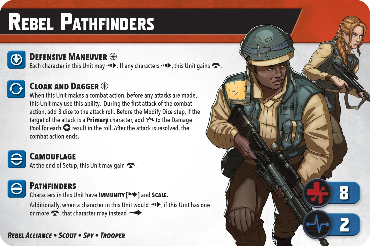 Meant to infiltrate, the Rebel Pathfinders can move and hold. They benefit from having a Hunker token, which they gain from their 'Defensive Maneuver' and 'Camouflage' abilities, as well as Cassian and K-2SO. For 4 PC, they have a rather straightforward combat tree and their abilities come across as just consistent. They do benefit from having the Spy keyword, which gives them some bonuses from Cassian, so on paper they're solid Rebel units meant to move in and hold a position. Supported by K-2SO, they could be difficult to remove from an entrenched position.