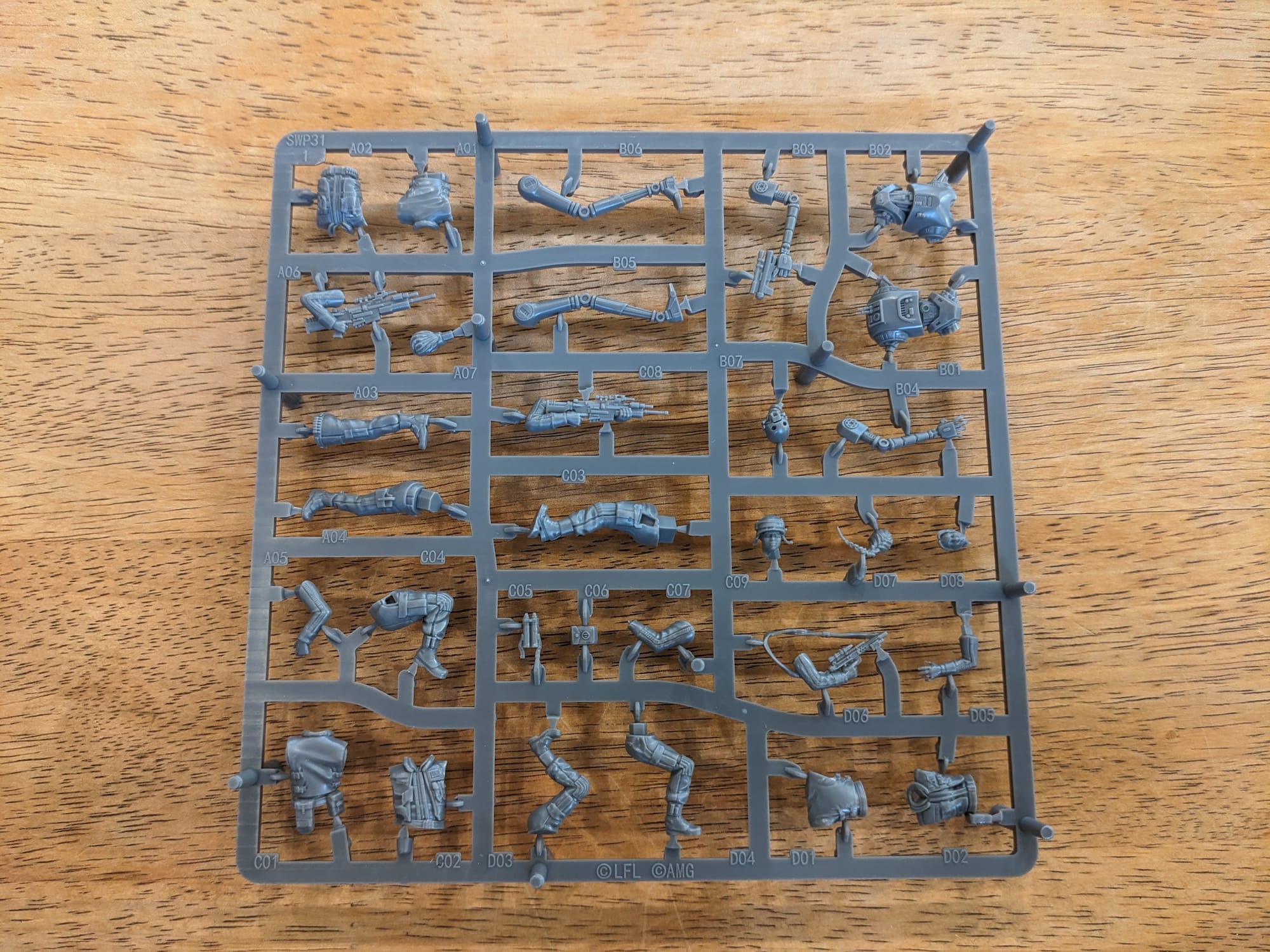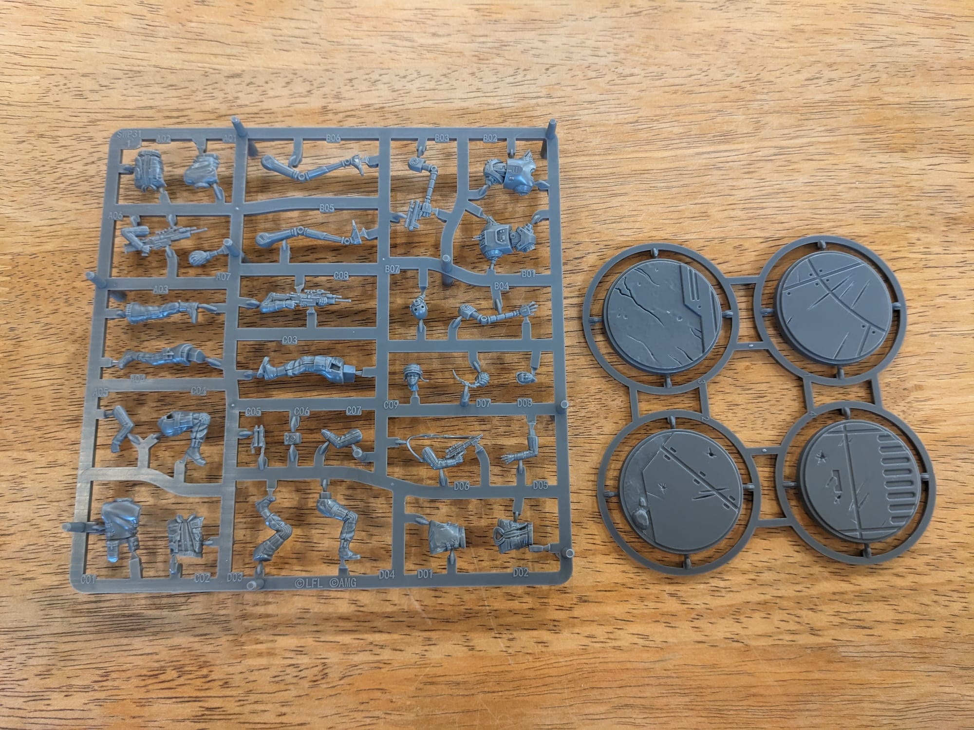 The whole squad comes on a single sprue and includes the four bases. Like all of the latest AMG expansions, there are four sets of cards, each for the four languages (English, French, German, and Spanish). I usually save my extras for the inevitable card update and use them as backers for my print-and-play cards.