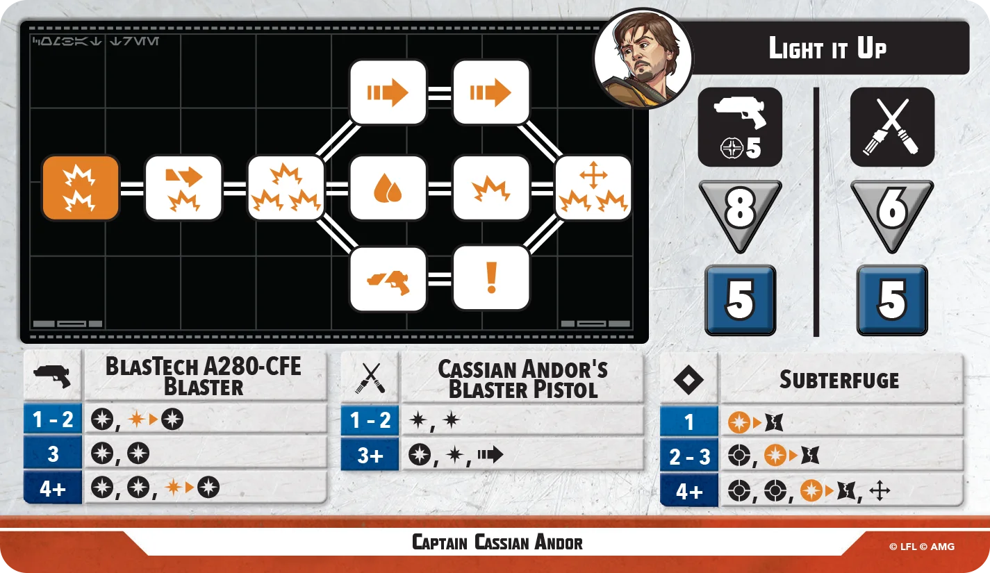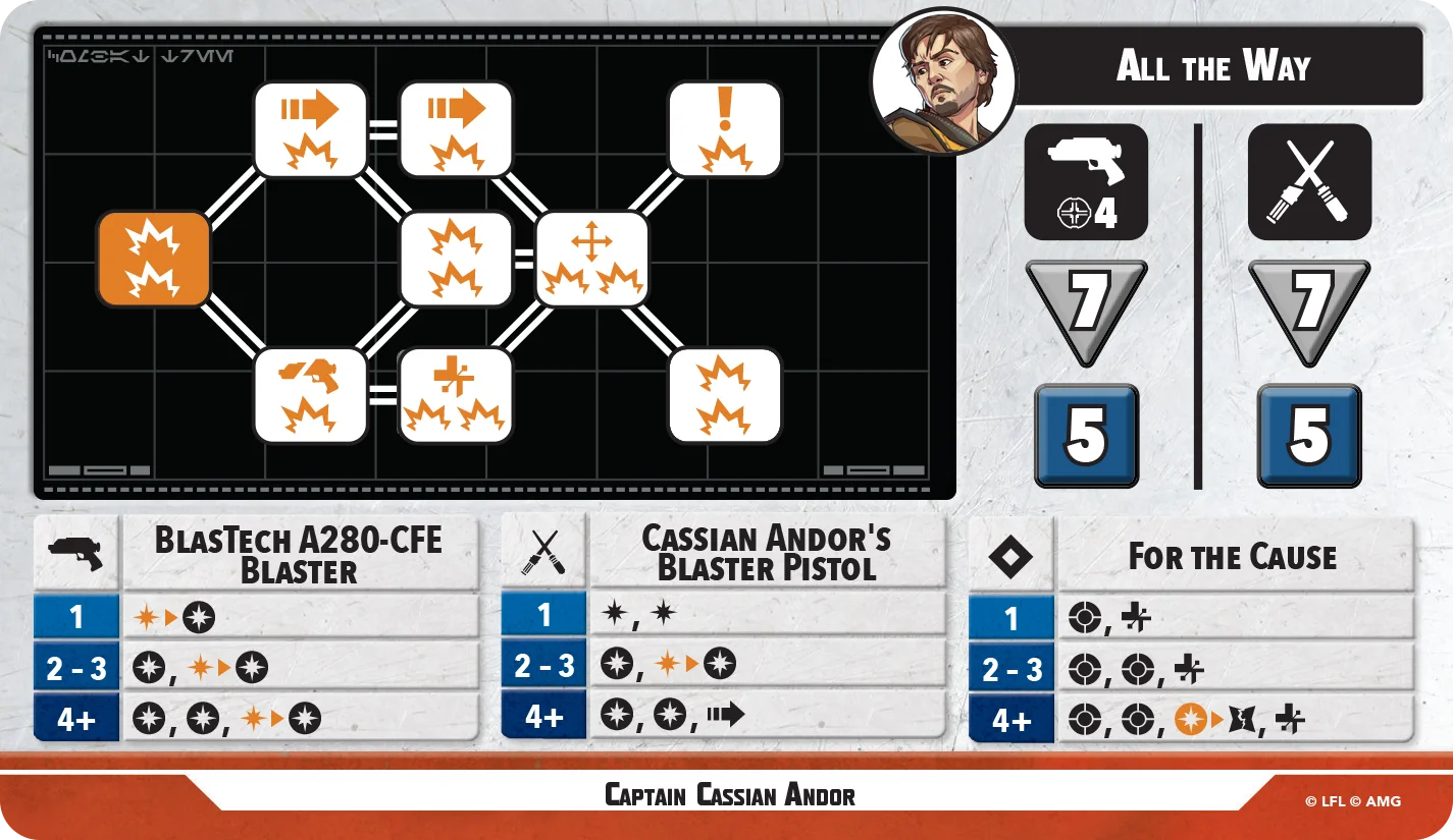 Boasting 9 SP and 2 Force, Cassian is meant to be a leader. His powers are best suited with Rebel Alliance and Spy keywords, but that doesn't mean he can't hold his own. At 10 health and an 8-die ranged attack, he can dish out damage both through attacks and through his abilities, even going so far as to add dice (at the cost of dealing damage to friendlies) through his 'We've All Done Terrible Things.' 'This Town is Ready to Blow' can cause a setback to your opponent after they claim a Struggle card by dealing damage to those characters contesting one or more Active objectives.