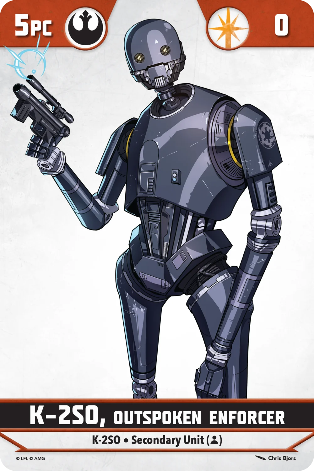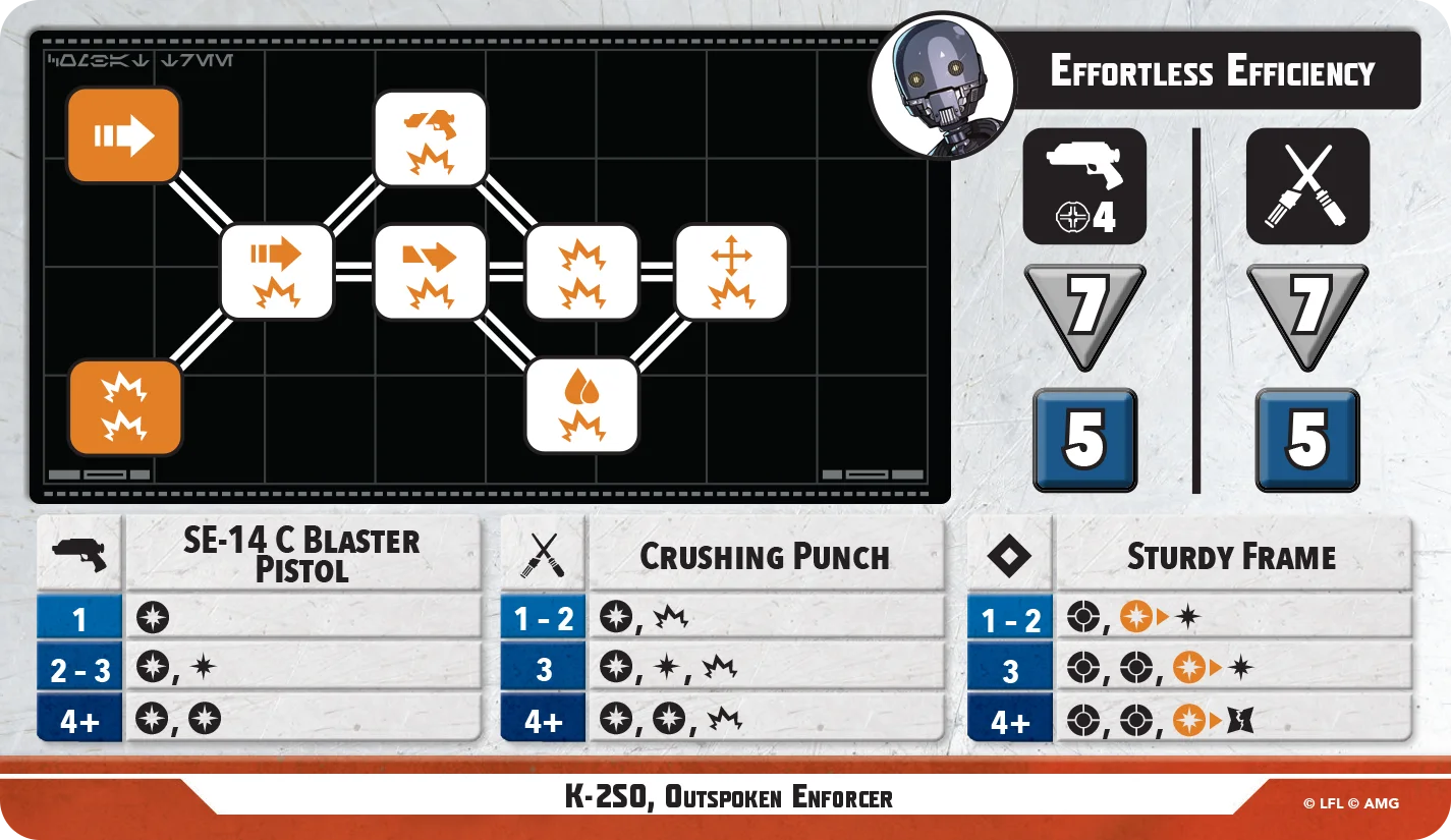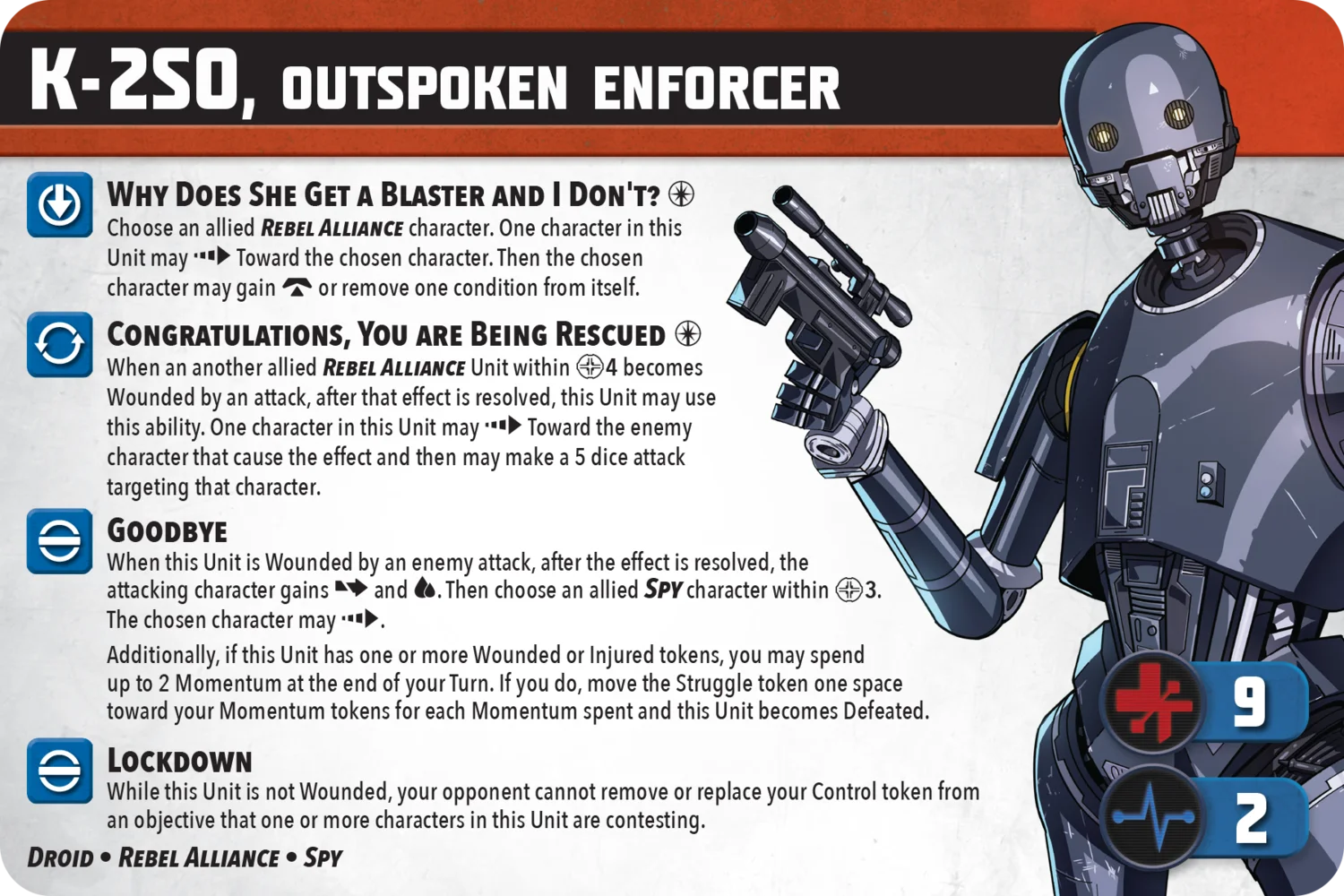K-2SO, the unfiltered friend, is meant to keep your Rebel Alliance and Spy allies fighting. For 5 PC, he does bring a lot of support to Cassian, but also to other friendly units. 'Congratulations, You are Being Rescued' offers a reaction attack against an enemy unit. Both 'Lockdown' and 'Goodbye' are objective-related abilities, with 'Goodbye' allowing K-2SO to spend momentum tokens to move the Struggle token at the cost of him being defeated (which could potentially win you the game). He can deal a fair amount of damage on his combat tree, and defensively he can take a lot of damage.