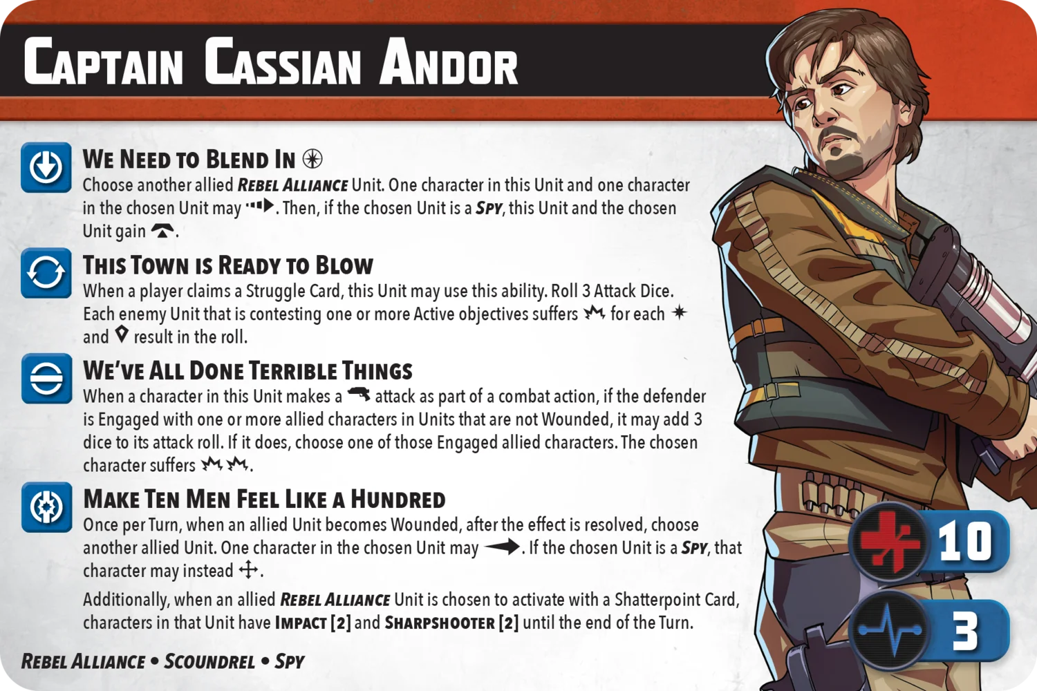 Boasting 9 SP and 2 Force, Cassian is meant to be a leader. His powers are best suited with Rebel Alliance and Spy keywords, but that doesn't mean he can't hold his own. At 10 health and an 8-die ranged attack, he can dish out damage both through attacks and through his abilities, even going so far as to add dice (at the cost of dealing damage to friendlies) through his 'We've All Done Terrible Things.' 'This Town is Ready to Blow' can cause a setback to your opponent after they claim a Struggle card by dealing damage to those characters contesting one or more Active objectives.