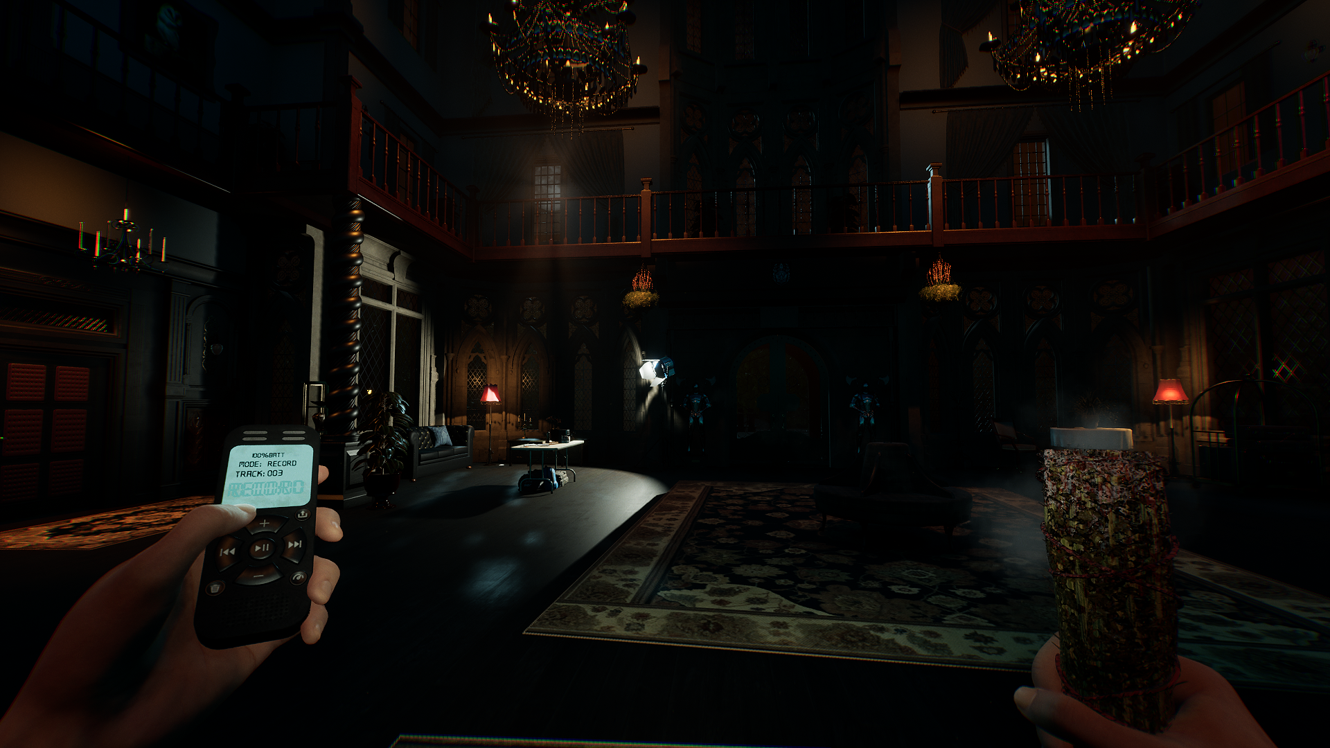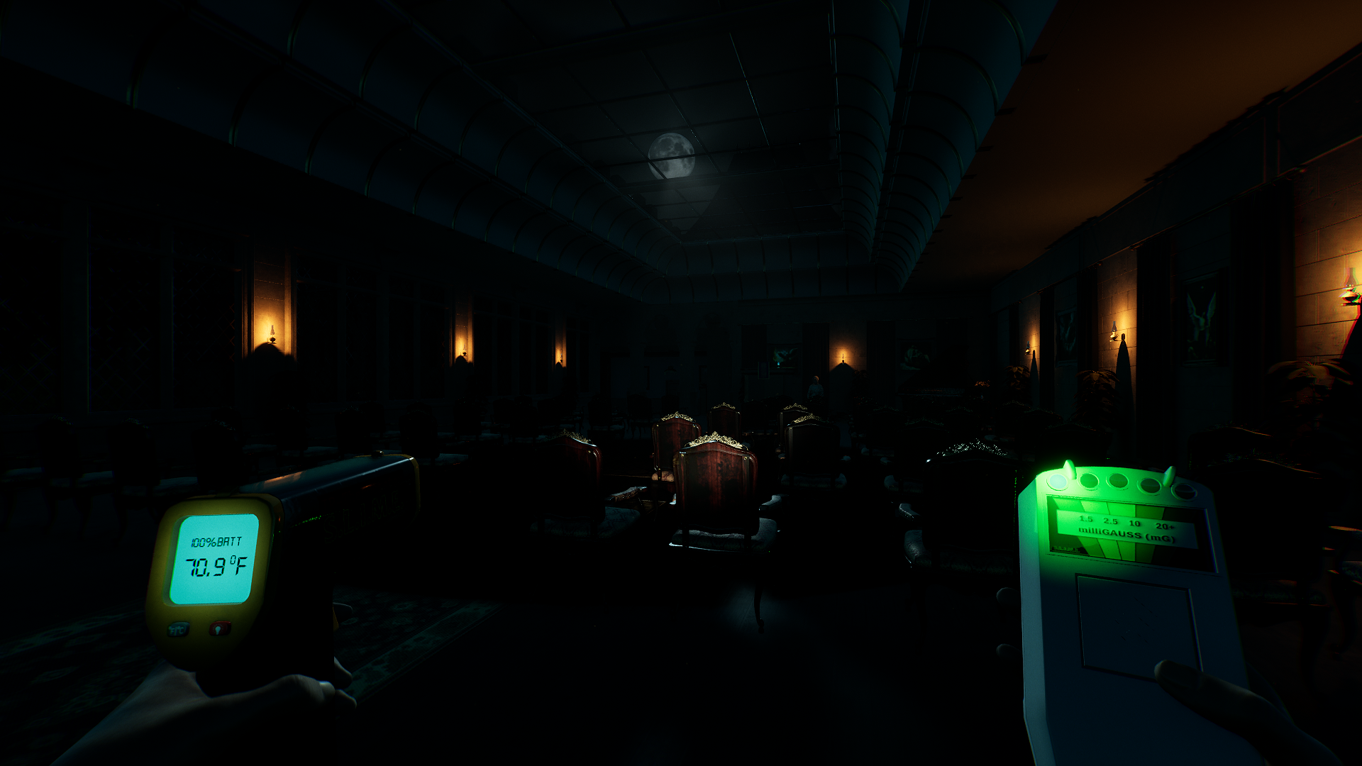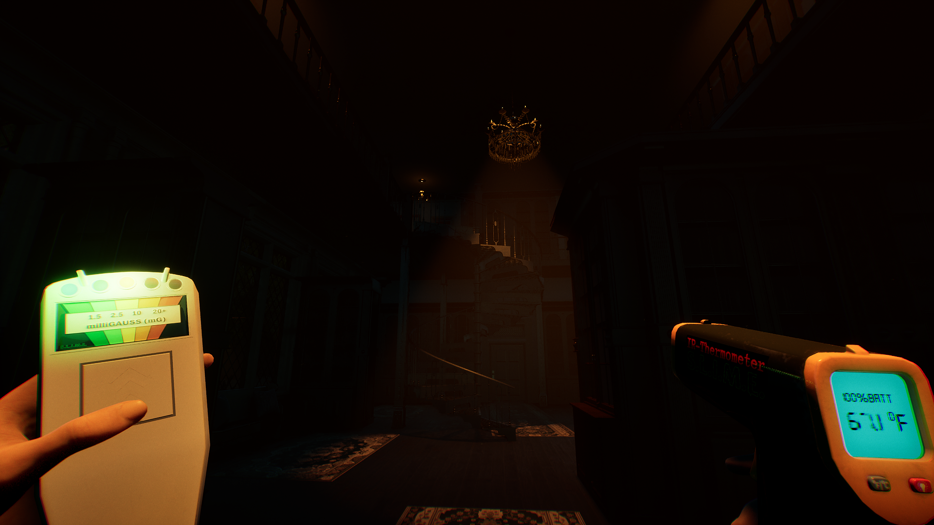 It’s not all about looks either. The room’s size and shape affect gameplay, with players needing to account for equipment setup, flashlight usage, and maneuvering around the ghost. The mansion is sprawling, and rooms vary in size and shape. There’s quite a bit of thought that goes into setting up your ghost detection gear. At one point, I was in a room small enough that the Dots pen covered basically all of it, so I put the EMF pod just outside the door so that I could have an audio cue for when the ghost was away. Some rooms might be large, giving you plenty of room to maneuver around a ghost if you need to preserve nerves, but making it harder to track them. Other rooms might be small, meaning the ghost might do a number on your nerves, but you’ll pretty much always know where it is. If a ghost blows out every lightbulb in a small room, then your radius flashlight will have you covered. If that happens in a large room, you’ll have to switch to the focus light for more illumination, but it’s only in a tight circle, possibly giving you tunnel vision.