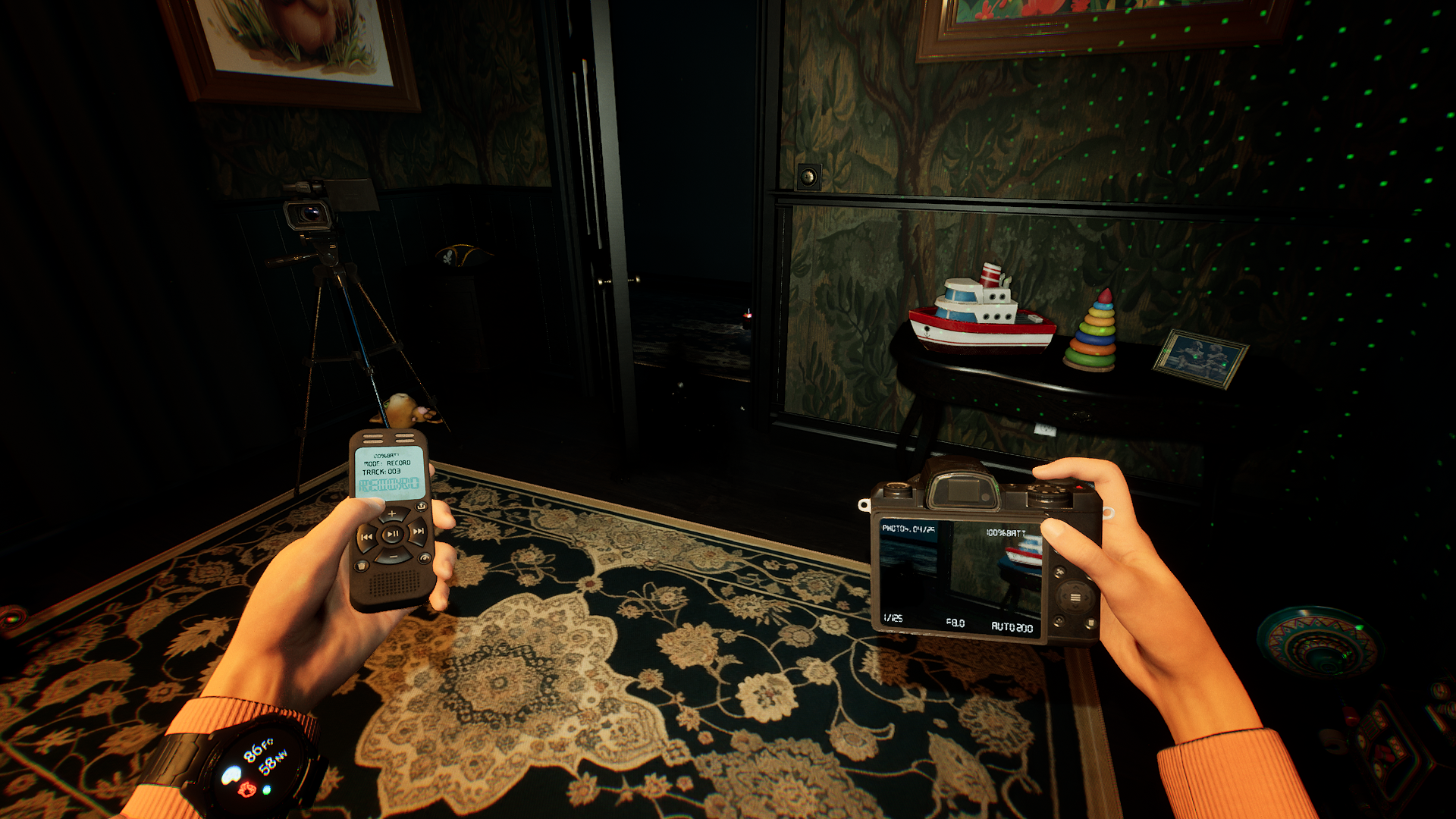 The game makes it easy to organize your evidence in an immersive way. Stephanie carries a tablet around with her, and she uses it as a ghost deduction board. It’s here you can upload your evidence and ancestry profiles, and mark them with color-coded symbols which act as the red string on your digital cork board. Any of your equipment that produces media has physical buttons used to upload and delete media, as well as click through your stored photos, videos, and audio. I appreciate how the game uses diegetic UI elements, like physically cycling through your evidence, increasing or decreasing volume on your recorder, and closing out of Stephanie’s laptop using a power button. These little touches can lead to frightening moments. There were times when a ghost pops up while I was fumbling around with the camera controls, and I had to quickly recover to prevent nerve loss. Overall, it’s important to remember that the deduction board is an invaluable tool that saves you the time of having to walk all the way back to base camp whenever you need info.