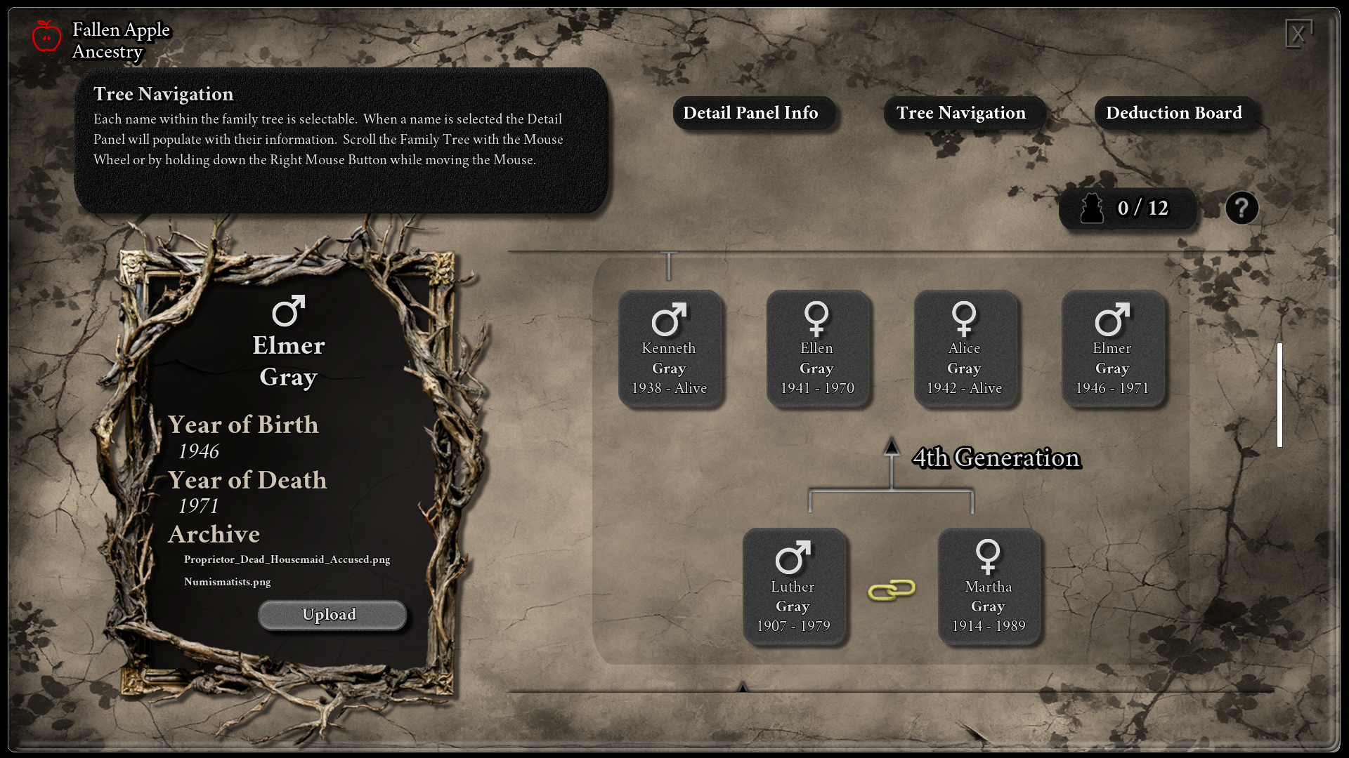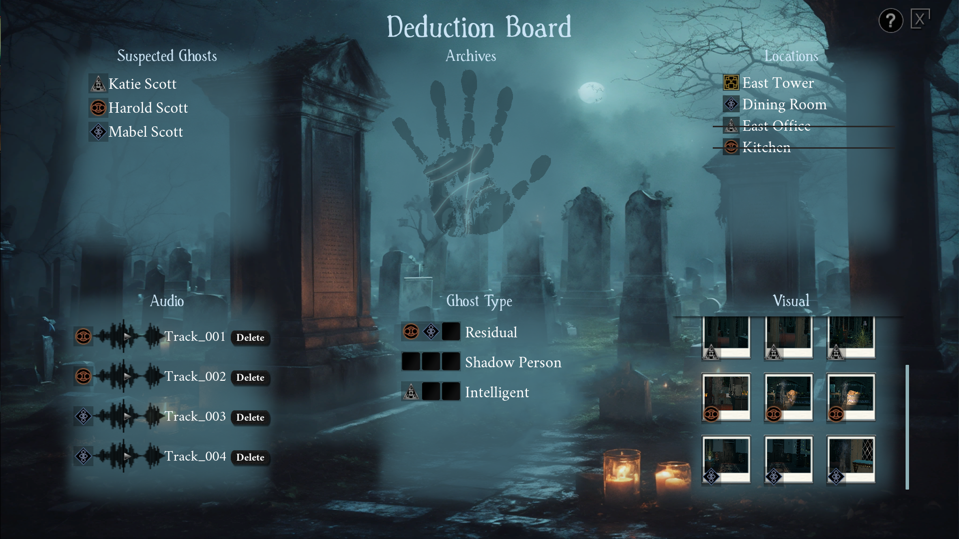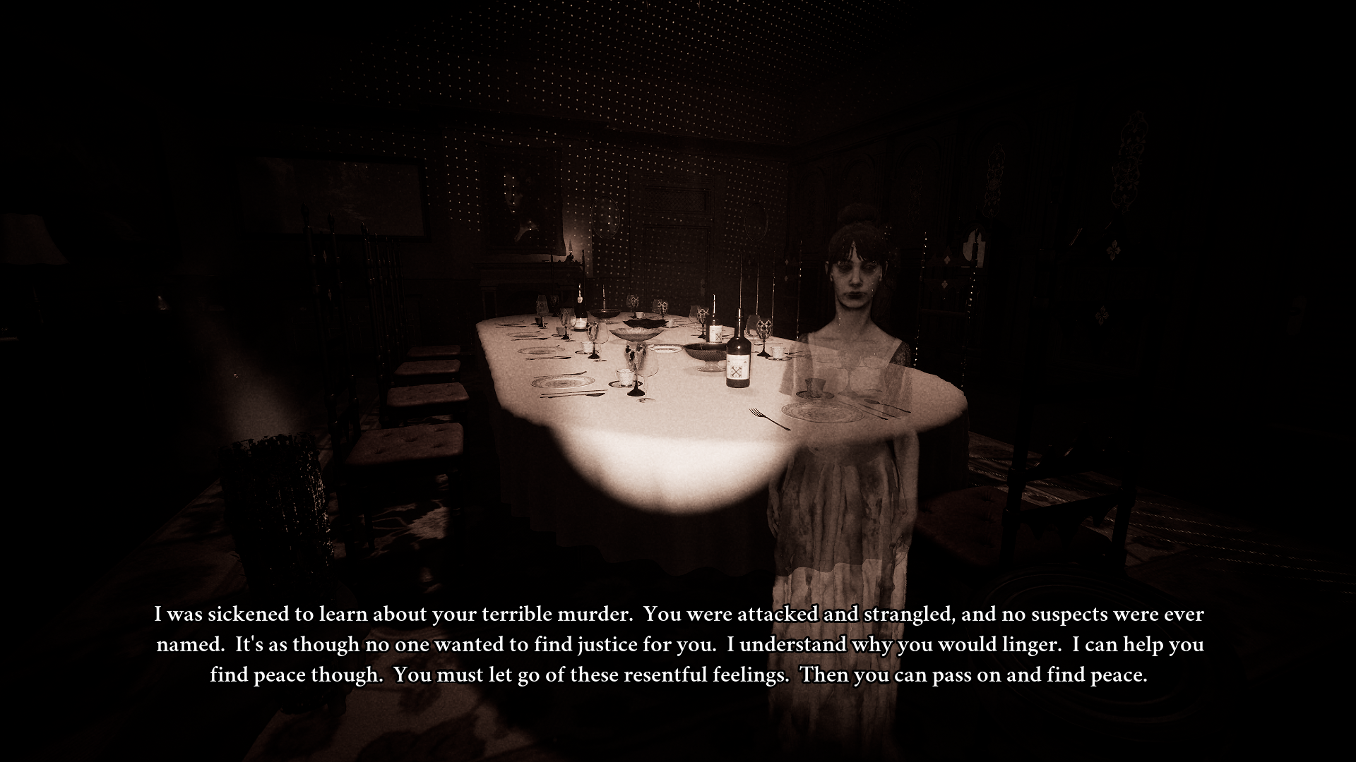 Let's say that you’ve gotten the ghost to max level and gathered some evidence by using provocations: a few photos and some audio. Time to release the ghost, right? Well, not quite yet. In order to help a ghost move on, you’ll need to address them with their full name, life passion (including a physical item), and cause of death. This is the part where you head back to base camp and look over the ancestry records on Stephanie’s laptop. When I said the mansion is historic, I wasn’t being dramatic; the influential family that calls it home has lived in it for well over 100 years. Naturally, that leaves many suspects. Luckily, each profile includes information on the individual’s death and hobby, as well as the location of a physical hobby item. Sometimes you’ll get lucky and a ghost will straight up tell you it was strangled, though audio clips are a little harder to make out when the ghost is lower level. Other times, you’ll have a photo of the ghost grasping its throat. Was it poisoned? Strangled? Choking on food? You’ll have to refine your search. You’re always looking for that smoking gun.