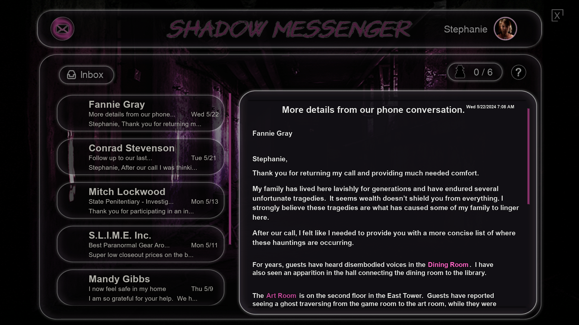 Zooming in, the gameplay itself takes place on Magnificent Drive, more specifically, in a mansion. The estate has a numbered address, but I’ve forgotten it. The numbers simply don’t matter. Insofar as the name is concerned, the building itself IS Magnificent Drive—it renders all other homes in the area to mere hovels in terms of significance. At most, other homes gain the status of archival footnote because of their proximity to Magnificent Drive’s unfathomably wealthy inhabitants. Vast in size and monumental in historical value, the estate is a gold mine for paranormal activity, and it’s Stephanie’s job to get the property sorted out by helping the ghosts pass on.