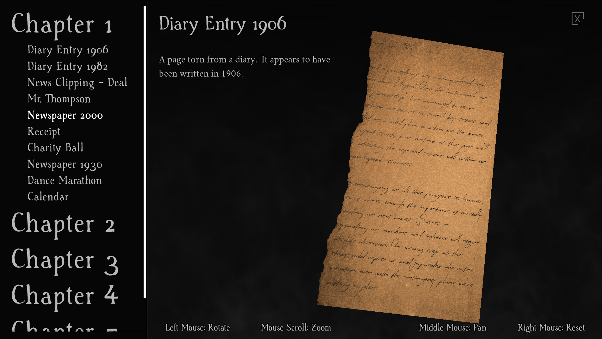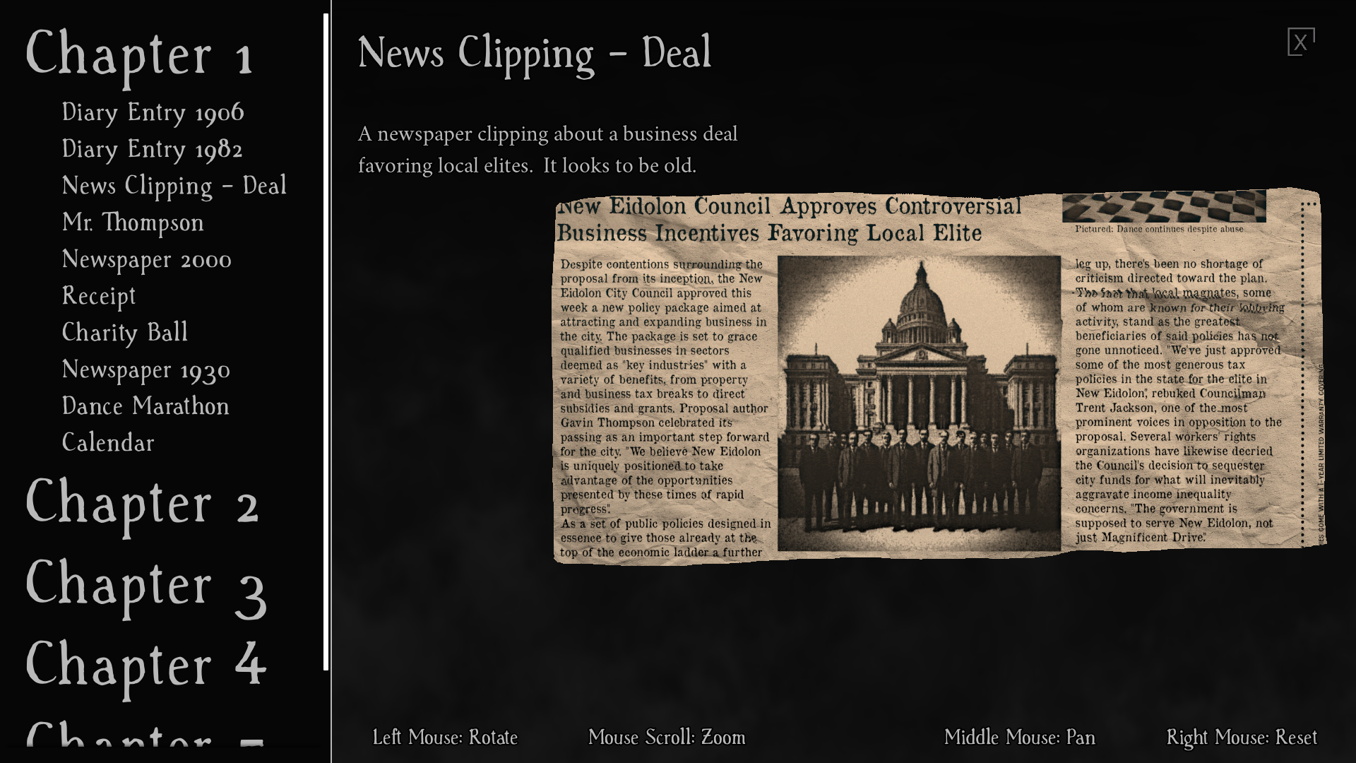What I didn’t mention is that there’s an overarching story. Magnificent Drive belongs to an incomprehensibly wealthy family whose lore goes back decades; you can bet there are skeletons in the closet. You will repeat ghost hunts many times in many different rooms, occasionally coming across archive evidence, which you need to photograph and upload to your deduction board. These include items like old newspaper clippings regarding New Eidolon’s past and old letters detailing business dealings and family correspondence, as well as missing persons posters and more. Picking up archive evidence and completing ghost investigations in new rooms progresses the story, with each chapter spawning new archivables. This story progression keeps the game fresh and the intrigue flowing. I won’t spoil anything, but I must emphasize that at certain moments, the story left me stunlocked with shock. It’s the “wait a second” moment where all of the information from all of the archives you’ve observed starts clicking together, and horrific realizations wash over you. If you played Paranormal PI, keep an eye out for familiar names while looking over the archives.