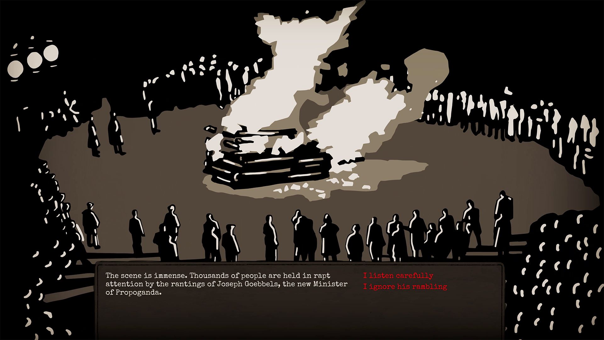 After generating your character, the game begins the moment Adolf Hitler is appointed Chancellor by President Paul von Hindenberg. You’re immediately tasked with building up a group of no more than five individuals who will assist with the tasks you strategically choose. Task difficulty ranges from easy to extreme, and the level of preparation also determines how likely you are to succeed. An easy task may have you be spotted, and an extreme task may, unfortunately, lead to your member’s demise. These values change depending on the skills and attributes of each member. Skills include an individual’s level of empathy, strength, intellect, ability to be stealthy, and how easy they can convince people. Attributes, however, include a number of factors about a character’s personality. This includes their religious stance, their employment status, and overall attitude. An example of a successful task would be using a Catholic member to speak to a group of other Catholics in order to gain their support. Types of tasks range from asking for money or gaining supporters, to stealing explosives or contacting a foreign source of assistance.