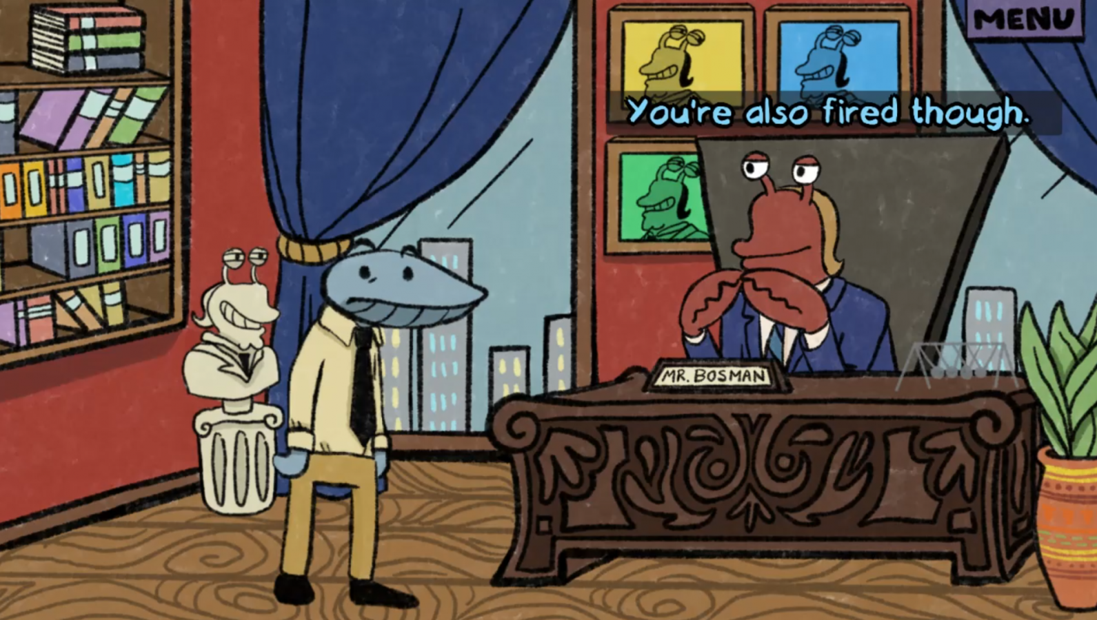 As previously mentioned, you play as Clam Man (yes, he’s a clam man named Clam Man. They poke fun at that in a few conversations during the game) who works at the Snacky Bay Mayonnaise Company. Clam Man was recently promoted to junior sales representative and is just working another day on the job. It isn’t long before one of his co-workers, Pete, mentions that another co-worker, Lindsey, got fired. After a short conversation, you learn that your boss has requested you in his office, so you make your way there. Make sure to talk to some of the wacky co-workers along the way; they’ll make you chuckle with their absurd personalities and mindsets. You end up getting fired, and after talking with Pete at the cafe, you realize that there’s something fishy going on. This begins your investigation into the shady business going on at Snacky Bay Mayonnaise Company.