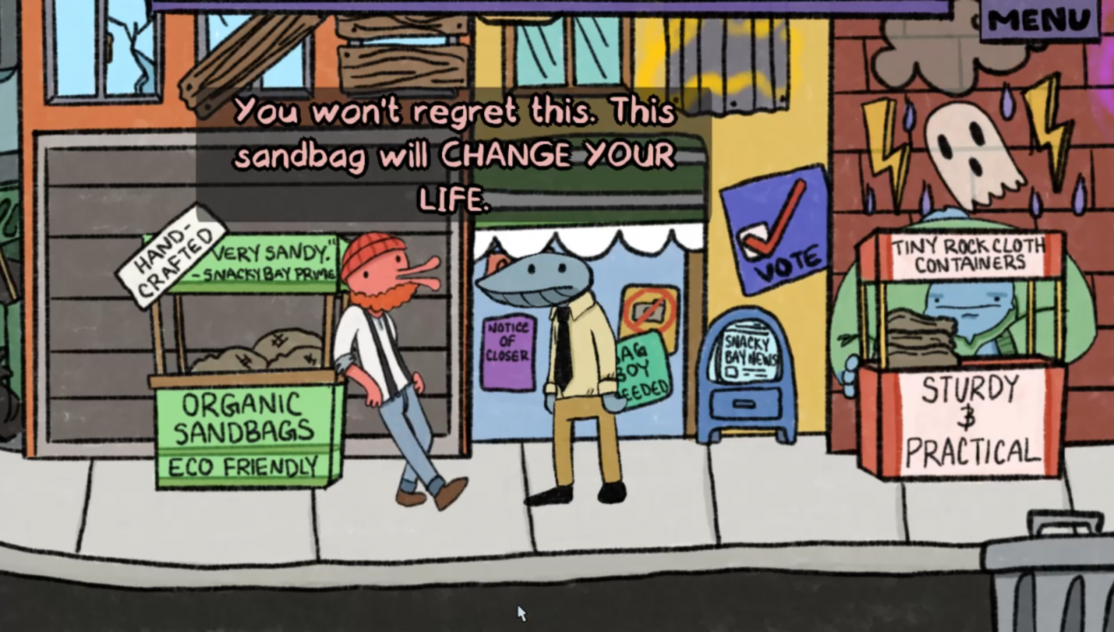Gameplay follows the standard point-and-click formula: click to move your character, talk with NPCs, and interact with your environment. Most of the game revolves around walking and talking to people. I highly recommend checking out as much of your environment as possible and talking to as many NPCs as you can. Just like the co-workers I spoke of earlier, the other parts of town have plenty of wacky, absurd humor to offer. Some of this absurdness comes from Clam Man himself, and I appreciated his corny and sometimes sarcastic comments. If you like nonsensical humor, then you’ll get some good chuckles out of your time with the game.