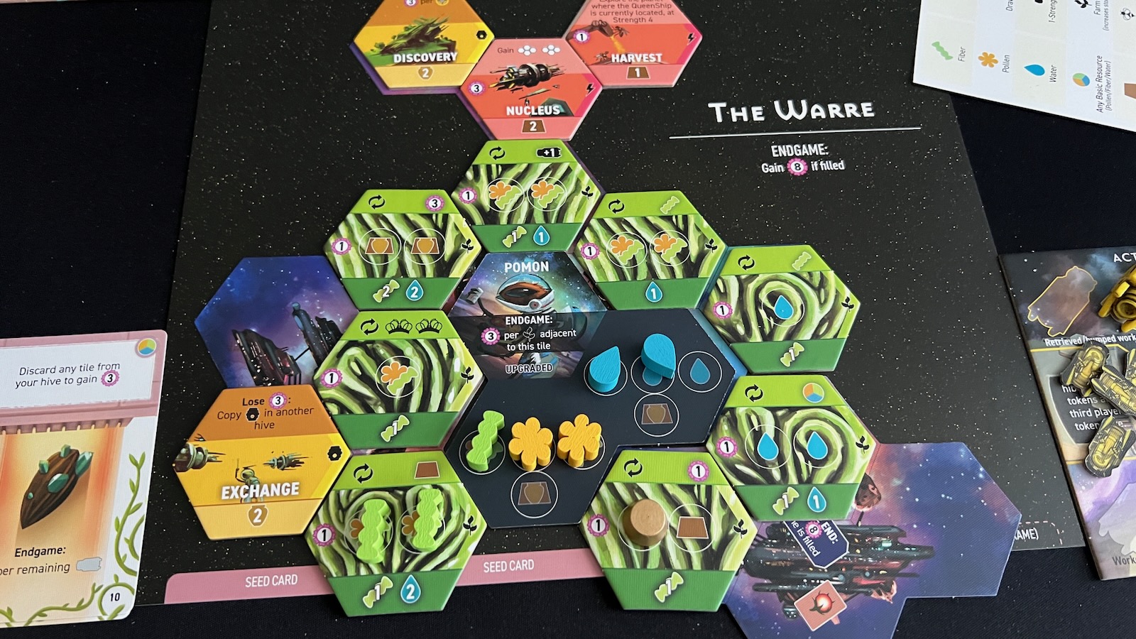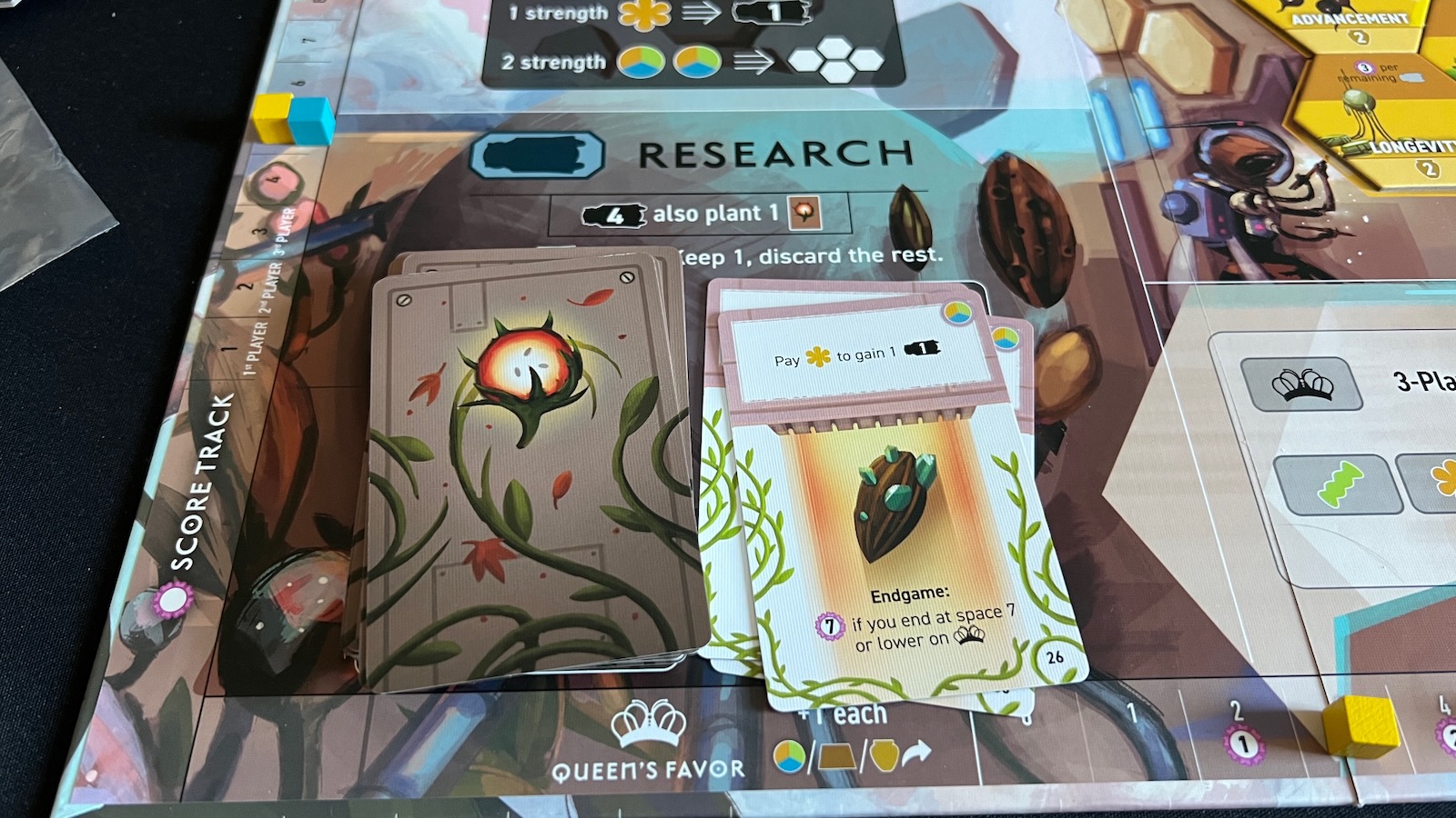 The Research area allows players to draw seed cards. These seed cards can be discarded to gain any basic resource or to use a special bonus on the card. Players will draw cards equal to the strength of the bee they play, but will only choose one of those cards to keep. If playing a strength 4 bee, players can plant a seed card under their hive and give them a new end game scoring condition.