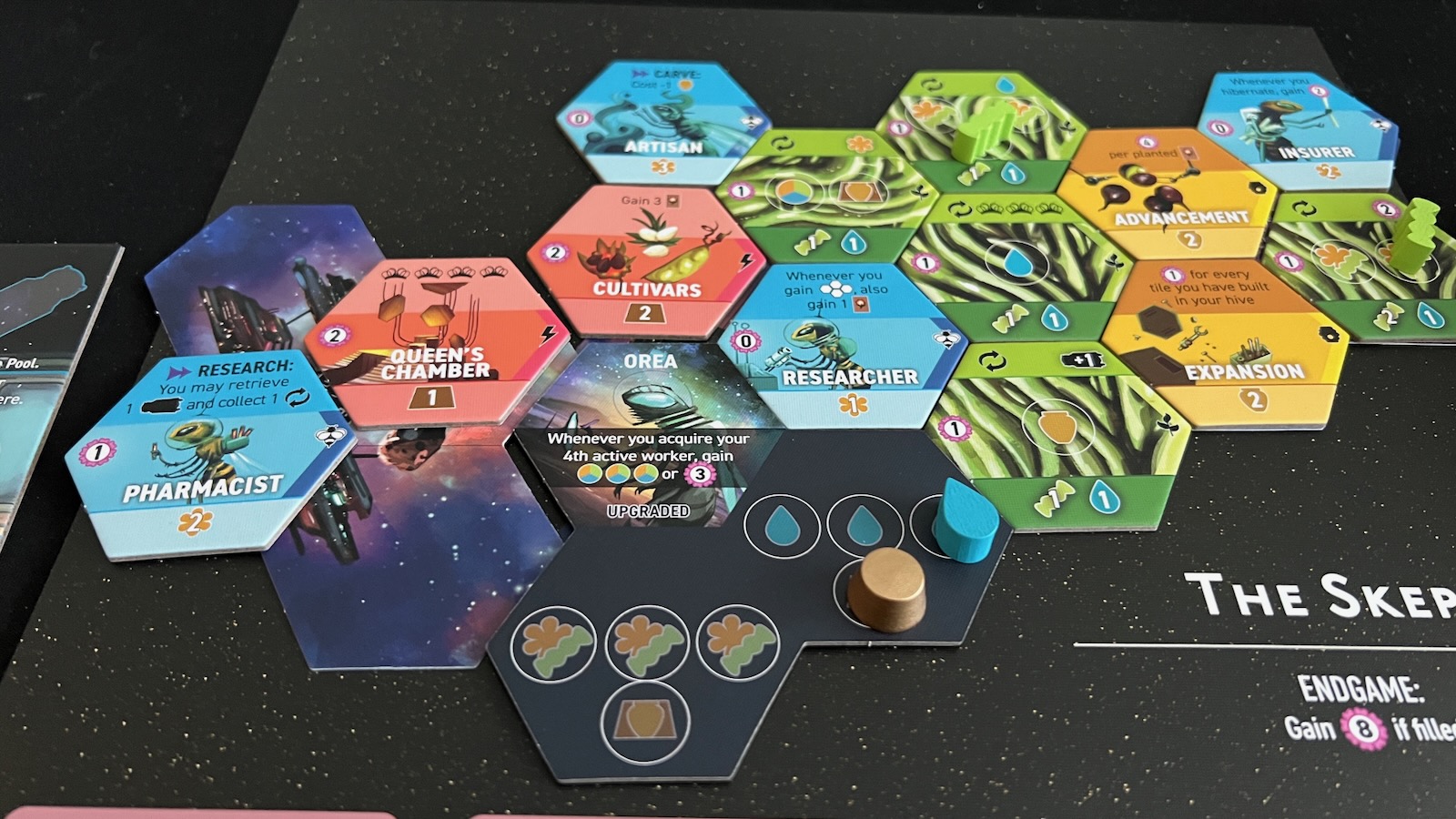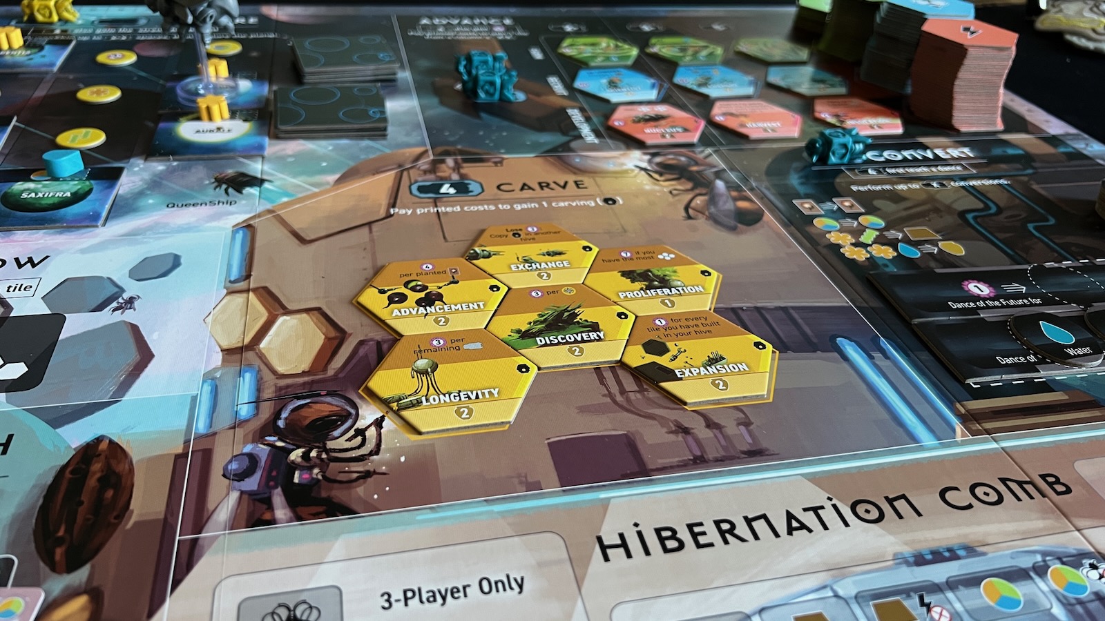 The Advance and Carve areas allow players to gain new tiles for their hive by paying a cost. The value of the bees in the Advance area give the players access to different face up columns of tiles. Players spend fiber and water to gain green farm tiles to add new resource storage slots and harvesting actions, activated when players retrieve their bees from the board. Players spend pollen to gain the blue recruit tiles which give ongoing bonuses for the players when triggered by other in game actions. Players must spend golden wax tiles to gain the red development tiles giving players one time bonuses. Players can only visit the Carve area of the board by playing a strength 4 worker. Players then spend golden honey tokens to gain the yellow tiles that give players special end game scoring conditions.